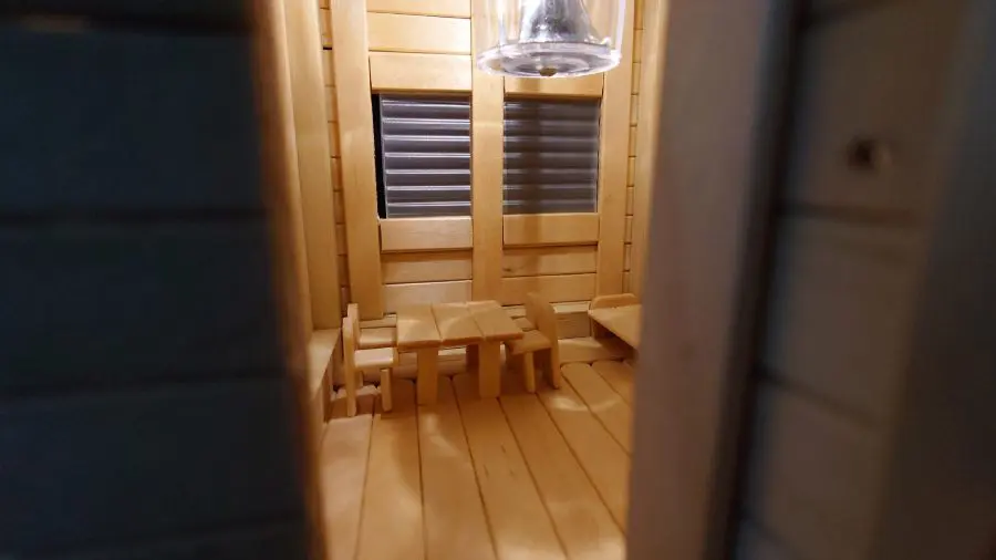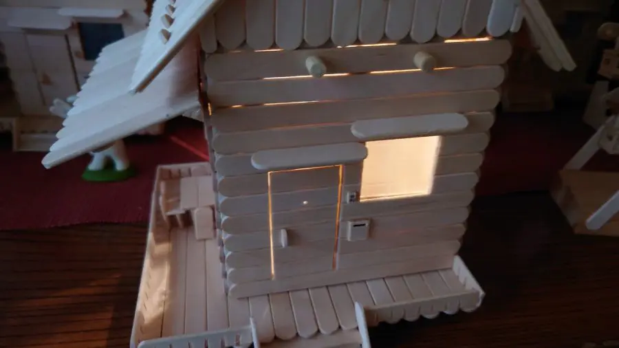 父親表示一棟房子約使用到 150 支木棍製成,內裝也完全不馬虎,還有簡單的布置與座位,更加工了燈泡讓它可以明亮起來,連窗戶都是用透明的塑膠罐製作而成。