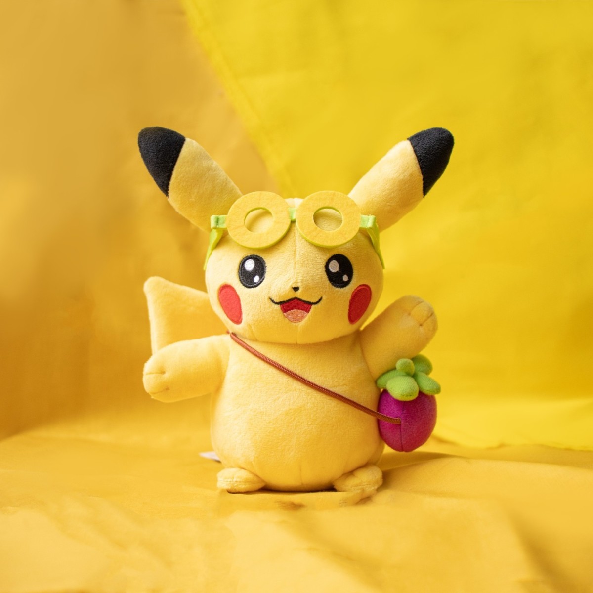 畢竟隨著代表寶可夢的公開,此次率先公開的商品不外乎就是快龍,以及皮卡丘的絨毛娃娃,不僅忠實呈現出先前插畫,飛在空中的快龍雙手捧著藏著甜竹竹的水果籃模樣,皮卡丘的部分也如先前亮相的模樣,揹著甜竹竹的斜背包,且戴著相當可愛的鳳梨眼鏡。