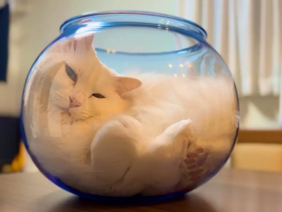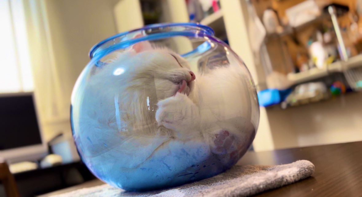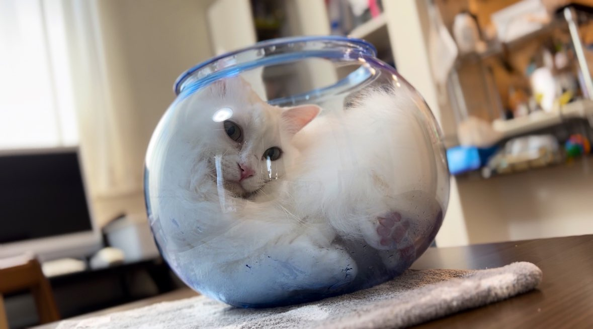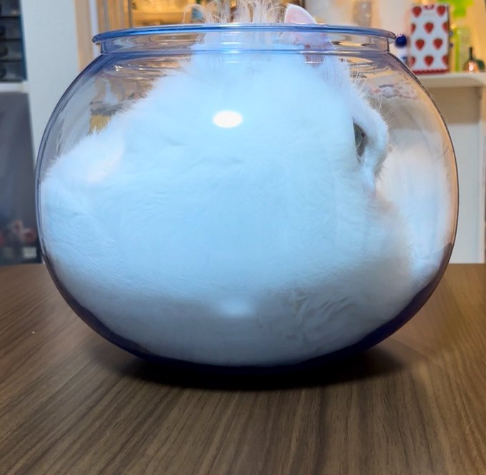 而最近日本推特上有位飼主雨と雪之丞(@5711Nakasin),分享了給自家貓咪買上魚缸嘗試讓牠住進去的成果,胖胖的貓皇窩進圓圓小小的魚缸之中,超可愛的模樣被大量網友關注,成為了人氣小網紅。
