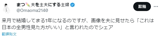 近日X(推特)上就出現了一個奇妙的話題,身為家庭主婦的X主「まつ 夫を主夫にする主婦(@Omaoma2140)」,就表示她下個月就要結婚滿一周年了,而她給先生看了某張圖片後,先生竟然表示「這張圖應該讓全日本的男性都看看」......?