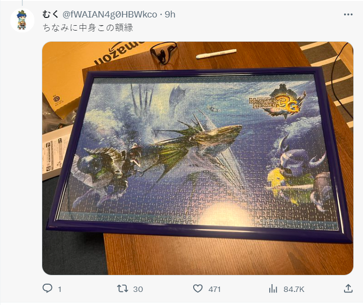 那到底推主訂的這是什麼呢 ? 原來是《魔物獵人3G》的大幅拼圖,雖說收到東西完好,但是搞到自己要跳陽台才能離開家裡真的很...衰,或許未來日亞的送貨員放貨品還是要注意一下,以免又有人要跳樓才能得救了 QQ。