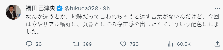 對此福田也表示,有粉絲認為這次機設有些地方不太對勁或是不起眼,並沒有要辯駁的意思,因為這次的配色就是要徧向呈現「真實的兵器」的存在感而設計的樣式,希望大家見諒。
