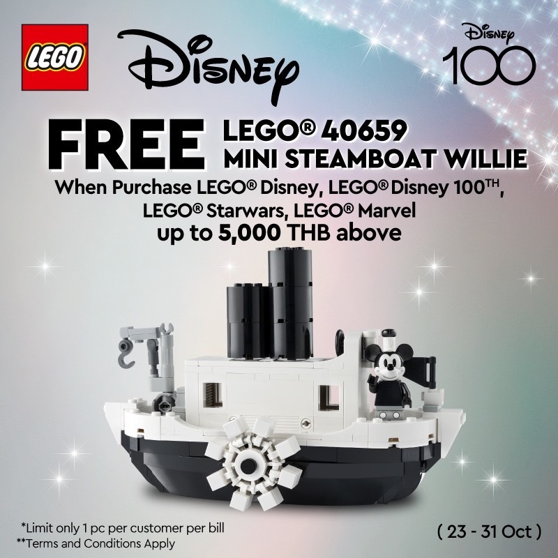 根據早先泰國樂高認證商店公開的情報,「40659 迷你汽船威利號」是接續「40597 恐怖海盜小島」的下一檔滿額禮商品,時間是從 2023 年 10 月 23 日開始一直到月底的 31 日,不過這款的入手門檻較高,必須消費迪士尼、星戰、MARVEL 的限定主題盒組,且金額來到 5,000 泰銖才能免費獲得。
