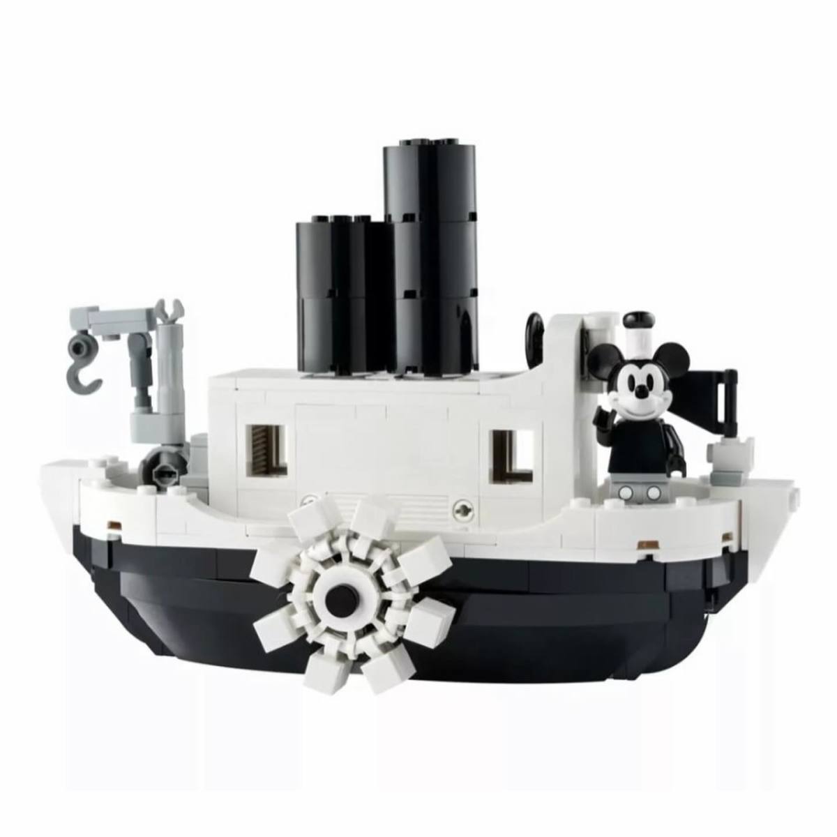 但是這套擁有 424 片零件、組完之後超級可愛的威利號實在太吸引人啦!雖說是過去 Ideas 系列「21317 汽船威利號」的縮小版,依舊有著優秀的造型完成度與兩處的可動機構,人偶則是附上一隻米奇(腿部印刷不同於 21317 的米奇)。