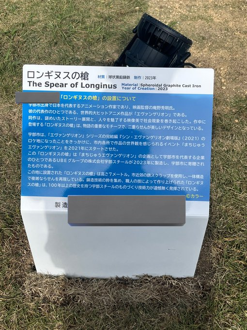 「まちじゅうエヴァンゲリオン」( 滿城福音戰士 ) 計劃是為了紀念宇部市出生的庵野秀明導演,以《新世紀福音戰士》系列為啟發,也是地方政府與其的結合。今年已經是第 3 彈,將於 10 月 6 日至明年 1 月 8 日舉行,而本次的7 公尺的「朗基努斯之槍」造景設施就是最大宣傳,預計還會有美食祭典等活動舉辦。
