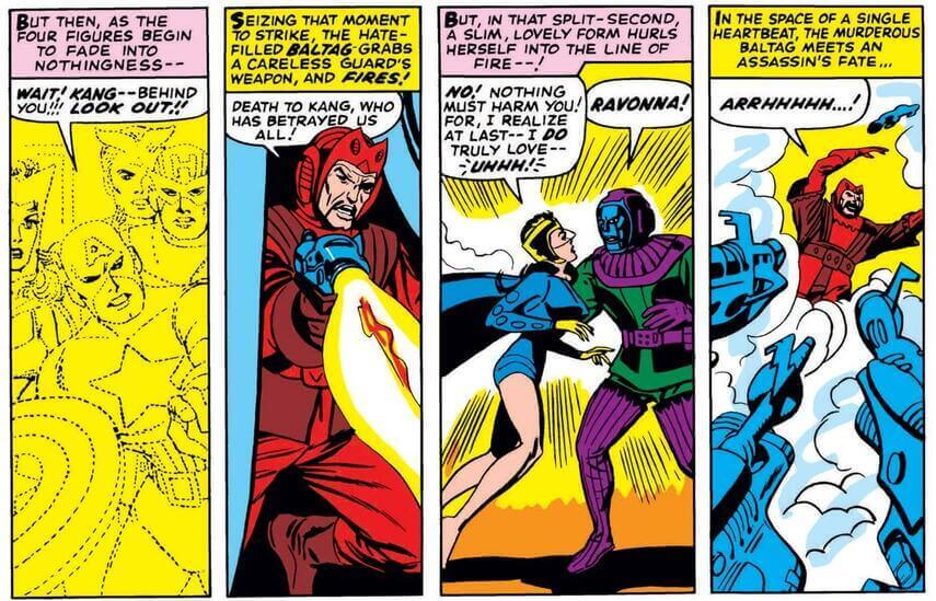 不過在漫畫中,拉芙娜來自40世紀,是卡雷利斯國王(King Carelius)的女兒,但因為康對拉芙娜的迷戀,所以讓卡雷利斯的國家得以免於攻陷。「暈船者」康多次向拉芙娜求愛,但因為自己的身分遭到拒絕,因此他決定召喚復仇者聯盟來對抗自己,以證明自己的實力。