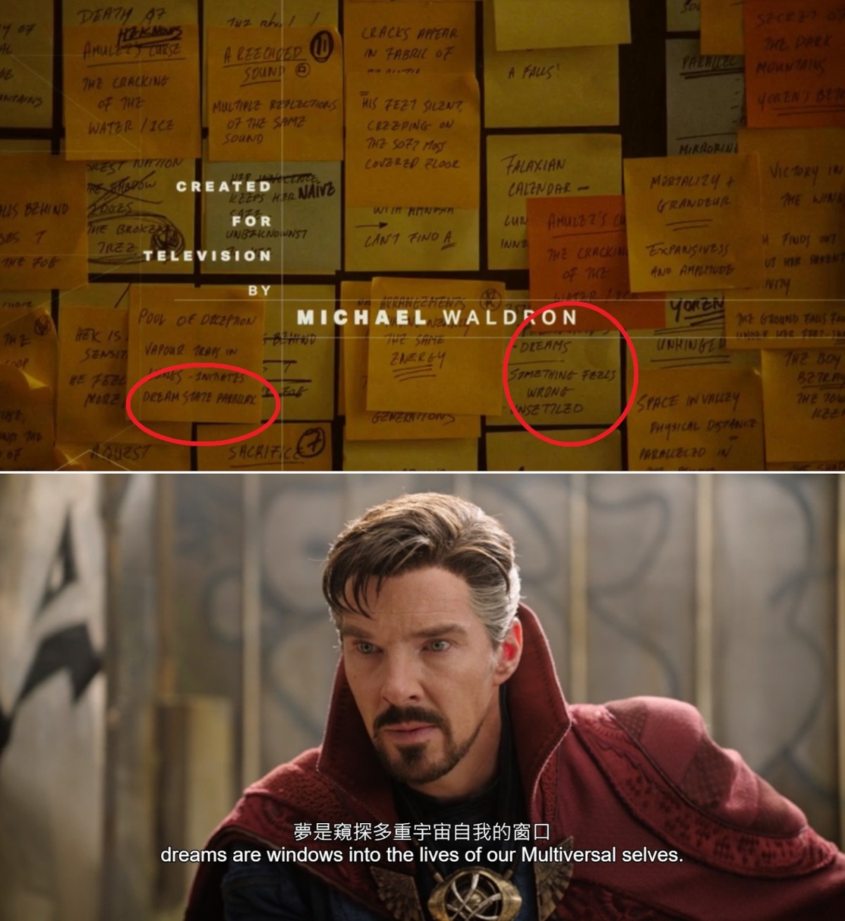 片尾字卡有些值得注意的細節,其中這幕有許多便條紙,都註記了跟「夢」相關的用詞,例如「夢境狀態悖論」(Dream State Paradox)可能和《奇異博士:失控多重宇宙》中汪達的夢行能力,以及奇異博士說「夢是另一個宇宙」的理論有關。