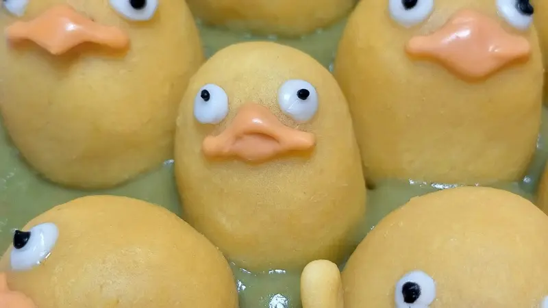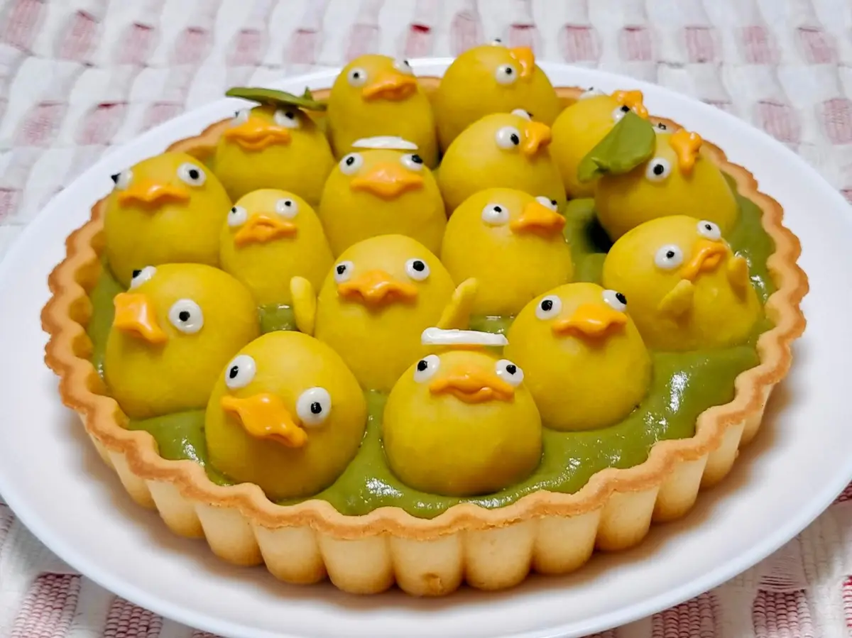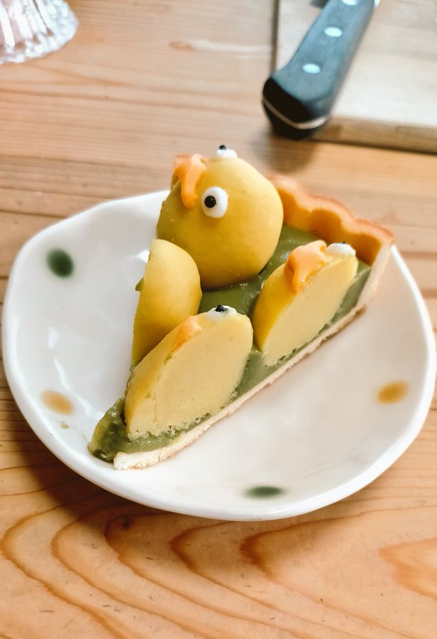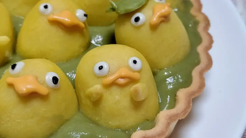《神隱少女》動畫之中,出現了各種樣貌的神明,其中「大鳥神明」( オオトリ ) 可說是不少人記憶中可愛的代表之一,看起來像是黃色小雞的般的可愛模樣,在湯婆婆的湯屋中洗澡的場景絕對是經典之一,而推主前川さなえ也就是參考這個畫面,將其變成可愛的甜點。