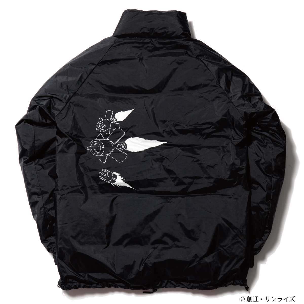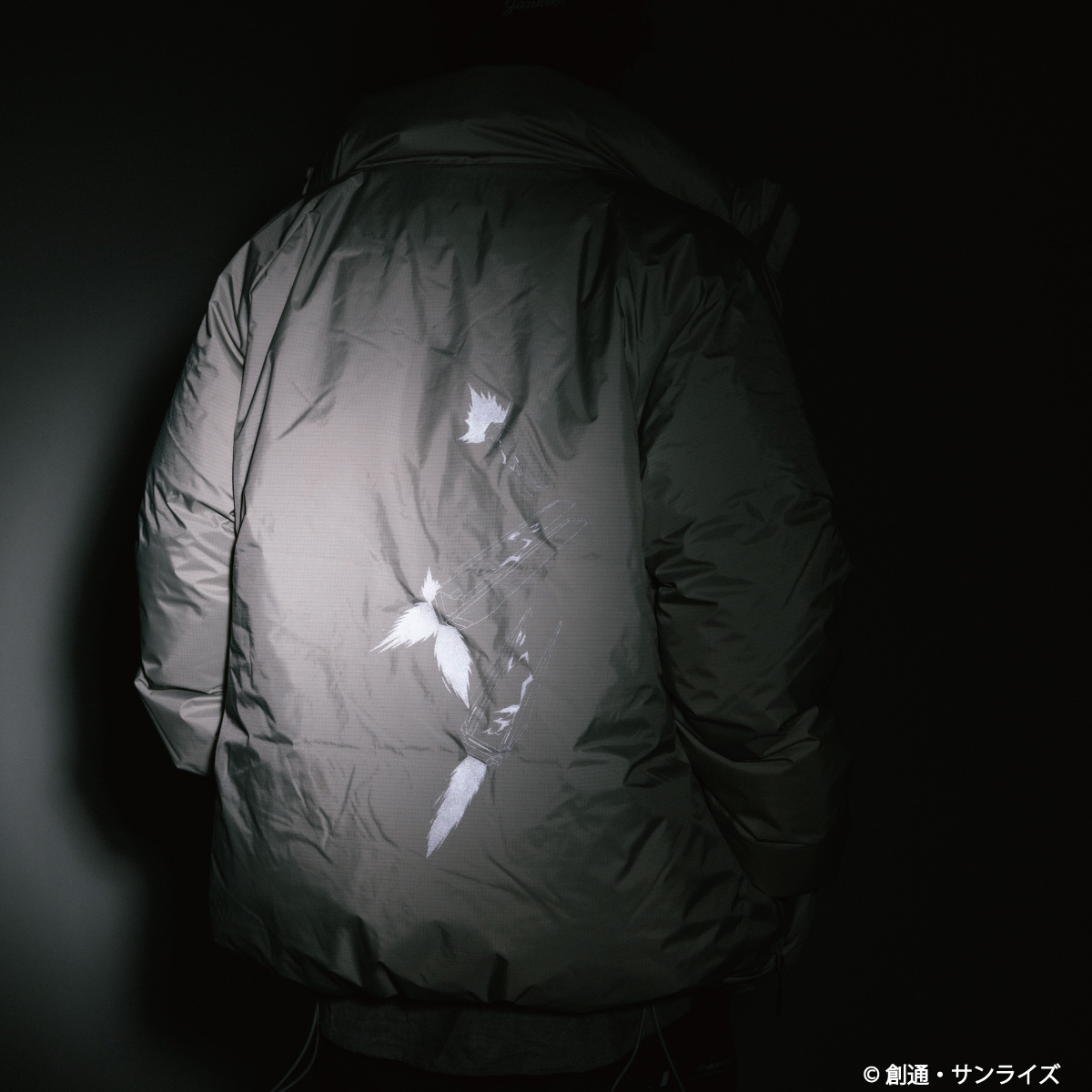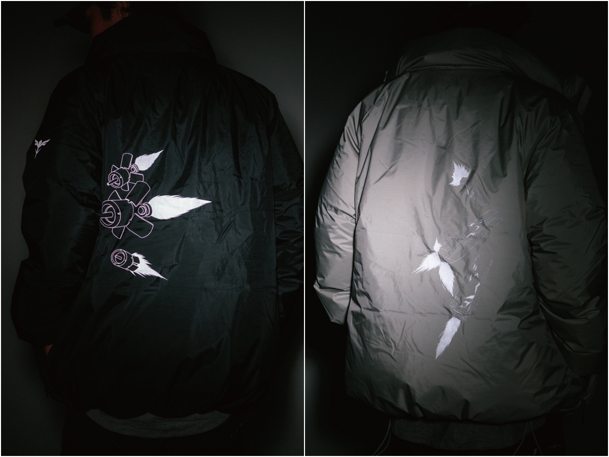 以黑色為基底,加入了反光的拉鍊與印刷圖案作為機能性的表現,拉鍊也都使用防水功能的樣式,內裡使用 9 : 1 的羽絨羽毛比例填充,有絕佳的禦寒功能。同樣在背面使用了「浮游圓錐炮」圖案,加上左手臂的夏亞沙薩比的專屬圖騰,在黑夜中反光效果十分出色。