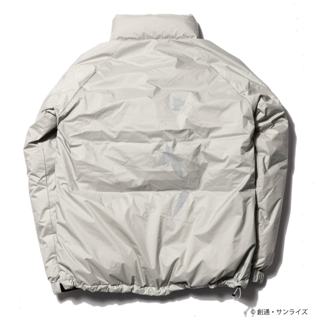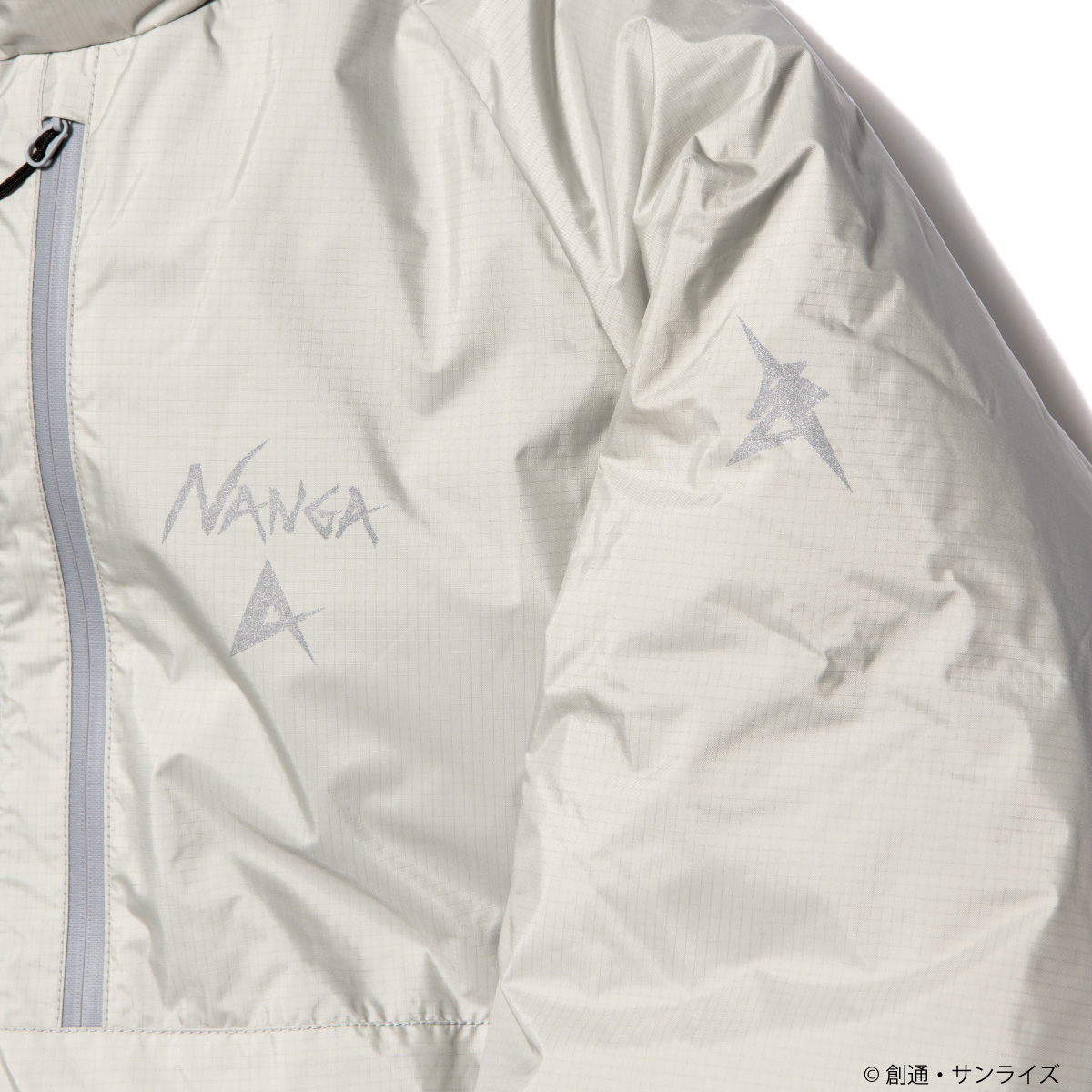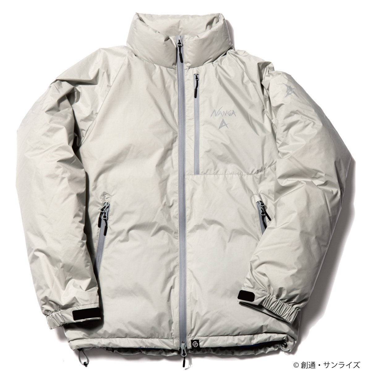 以灰白色為基底,加入了反光的拉鍊與印刷圖案作為機能性的表現,拉鍊也都使用防水功能的樣式,內裡使用 9 : 1 的羽絨羽毛比例填充,有絕佳的禦寒功能。最具特色的就是背面使用了「翼狀感應砲」圖案,加上左手臂的阿姆羅專屬圖騰,在黑夜中反光效果十分出色。