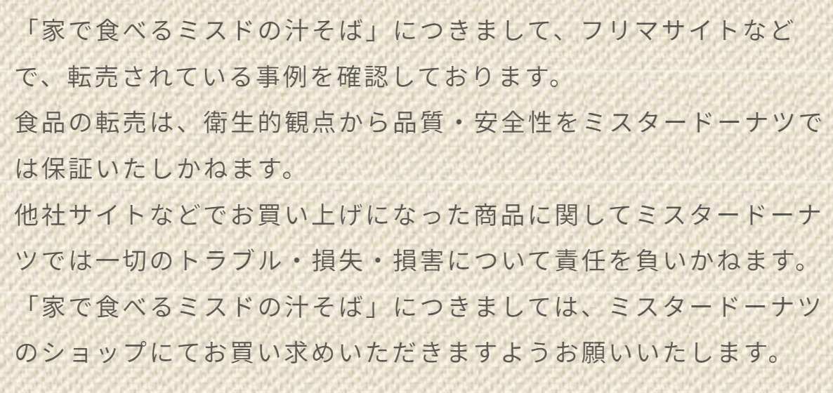 「能夠在家享用的 Mister Donut 杯麵」的轉售現象,也被官方所注意到,由於這些轉售品並沒有辦法提供衛生及安全保證,公告對於從其他公司網站購買的產品所造成的任何麻煩、損失或損壞,Mister Donut 概不負責,也希望各位消費者前往自家店鋪購買,以免不必要的問題發生。