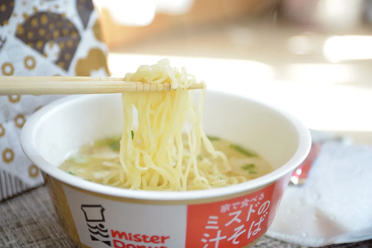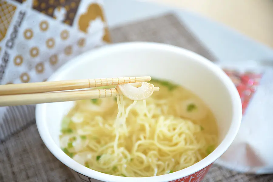 那這一款杯麵到底好不好吃呢 ? 根據日本網站おたくま経済新聞的試吃評價,湯底有著雞肉和海鮮的氣味,清澈的湯汁和細細的麵條很好地融合在一起,有展現出在餐廳能享用到的美味口感,附料包也有個很像甜甜圈的麩質食材,雖說泡開後吃起來並不特別,但也有著 Mister Donut 獨有的特色。