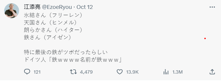 根據該日本網友發文表示,德國朋友對這些角色的命名感到困惑,像是芙莉蓮(フリーレン,Frieren) 這樣的字詞,應該是由德文語系發想而來的,不過這些都不是在德國會用在人名的字詞,反而讓德國人有點困惑為何這樣命名,產生了誤會。
