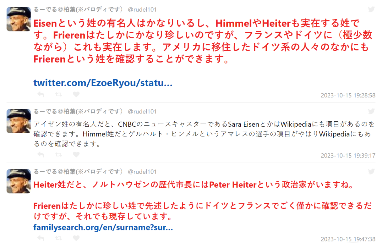 不過另有其他熟悉德國的網友指出,其實並非如此,「鐵」Eisen 這個名稱是源自於德語和猶太/意第緒姓氏,甚至在美國也有不少人的姓氏為此,而 Hammel 與 Heiter 更是實際存在的姓氏,應該除了 Frieren 較沒聽過外,其實都是真實有在使用的姓氏名稱。