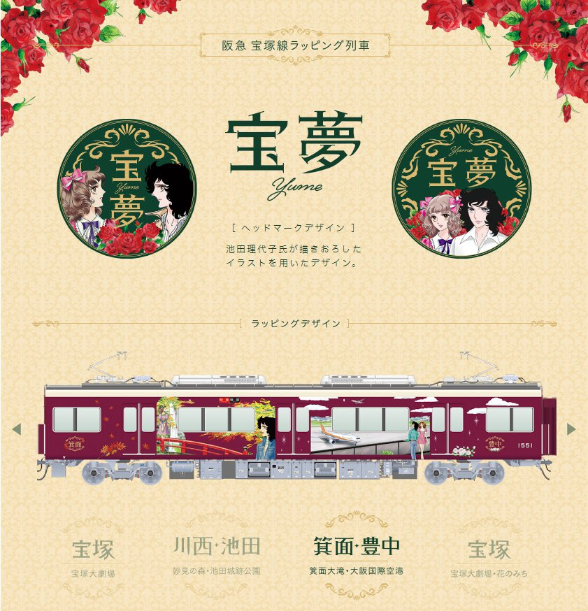 看到這個畫風相信大家並不陌生,這就是由《凡爾賽玫瑰》作者池田理代子所繪製。而這也是阪急電車在寶塚本線的特色,由於阪急電車經營由純女性組成的劇團「寶塚歌劇團」而知名,在繪圖上也展現出這種特色。
