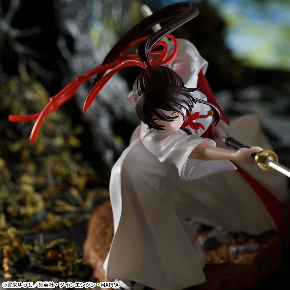 本作在 12 × 14 公分的規格中將「佐切」持刀揮砍、身體重心壓至極低的戰鬥姿態躍動立體化,從褐色長髮與紅色髮帶的飛舞動感,到白色和服因動作產生的飄動與皺摺都讓佐切的揮刀動作更具速度感,銳利的目光更是小編個人最喜歡的一大亮點,當你直面佐切、感受到眼神所帶來的壓迫感之時,說不定早已被佐切的刀刃貫穿胸膛,這種散發出強悍魄力的造型真的相當迷人,充分表現出佐切身為山田家處刑人的氣勢。