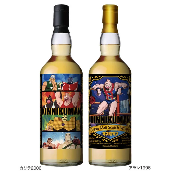 這次與動畫 40 周年的《金肉人》合作,以當年動畫的經典名場面作為瓶身包裝,兩款分別為原作的 : 夢之超人雙人組篇 & 金肉星王位爭奪編的樣式,當然也各位不同的威士忌款,供粉絲收藏。
