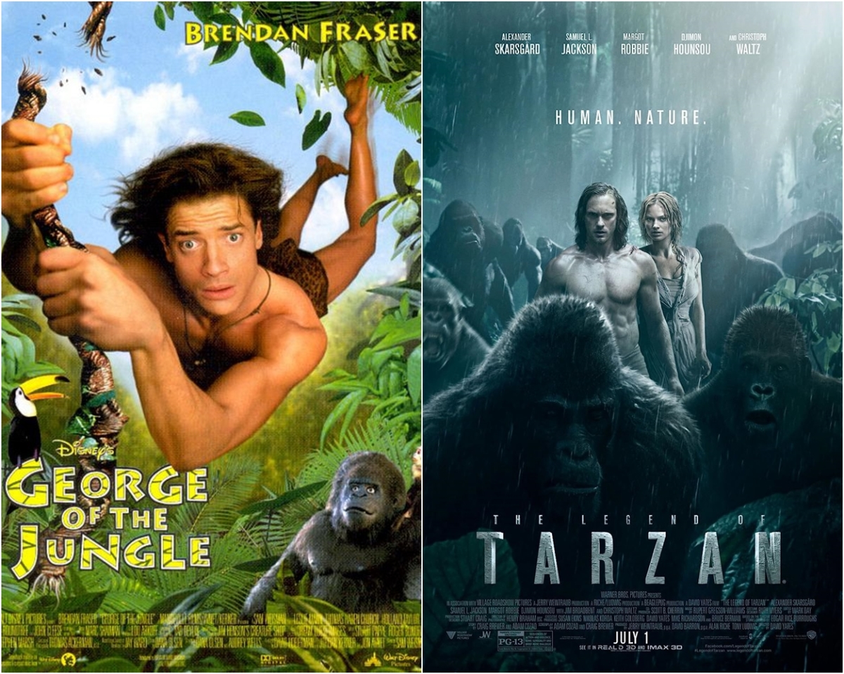 除了《冰雪奇緣》之外,同樣出自導演 克里斯巴克(Chris Buck)的經典動畫《泰山》(Tarzen)據報導也在迪士尼的真人化計畫之內。有關《猿人泰山》的真人電影已經不勝枚舉,迪士尼也曾在動畫版問世前,拍攝過布蘭登費雪(Brandan Fraser)主演的《森林泰山》(George of the Jungle,下左)電影;最近一部則是2016年威秀電影發行的《泰山傳奇》(The Legend of Tarzan,下右)由亞歷山大史柯斯嘉(Alexander Skarsgård)與瑪格羅比(Margott Robbie)主演。