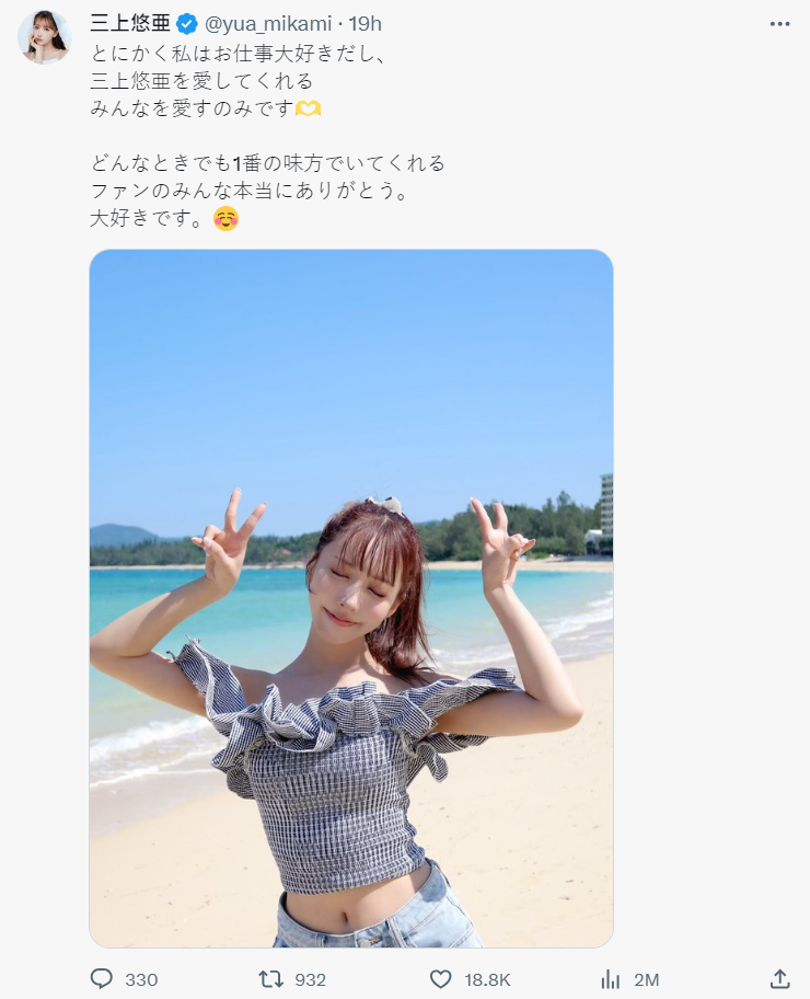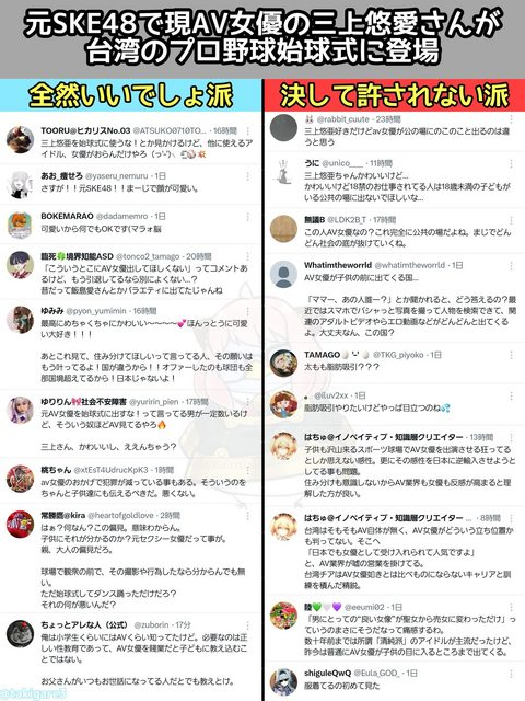 沒想到日本網友並不怎麼想,日網上出現批評聲浪,甚至有媒體撰文認為選擇這樣的身分開球對於孩童有不當影響,引發網民熱議。而三上悠亞也在昨日 ( 10/19 ) 在個人 X 上發文,表達對此看法以及粉絲的感謝。