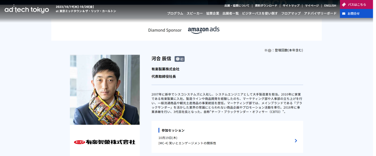 近日卻在日本 X 上熱議,原因是有樂製菓的社長 - 河合辰信參加 ad: tech tokyo 科技行銷展擔綱講師,所使用的宣傳照讓網友感到爆笑,讓這位年輕社長成為網路話題。