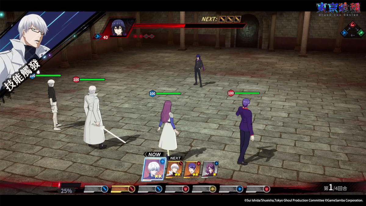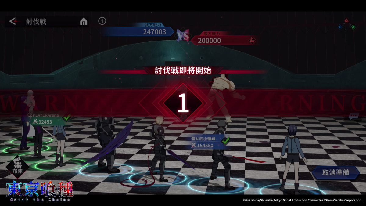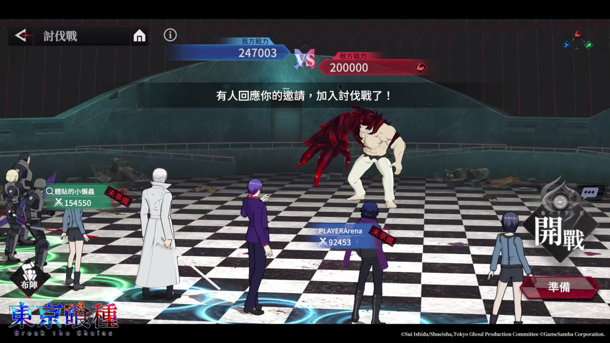 競技場內可以匹配其他在線玩家並進行戰鬥。戰鬥的勝負結果的統計和每一賽季的段位都會顯示在玩家的競技場介面中。根據對手的隊伍調整布陣,研究多樣化的戰略,提升段位,在東京喰種的世界裡展示自己的實力吧!