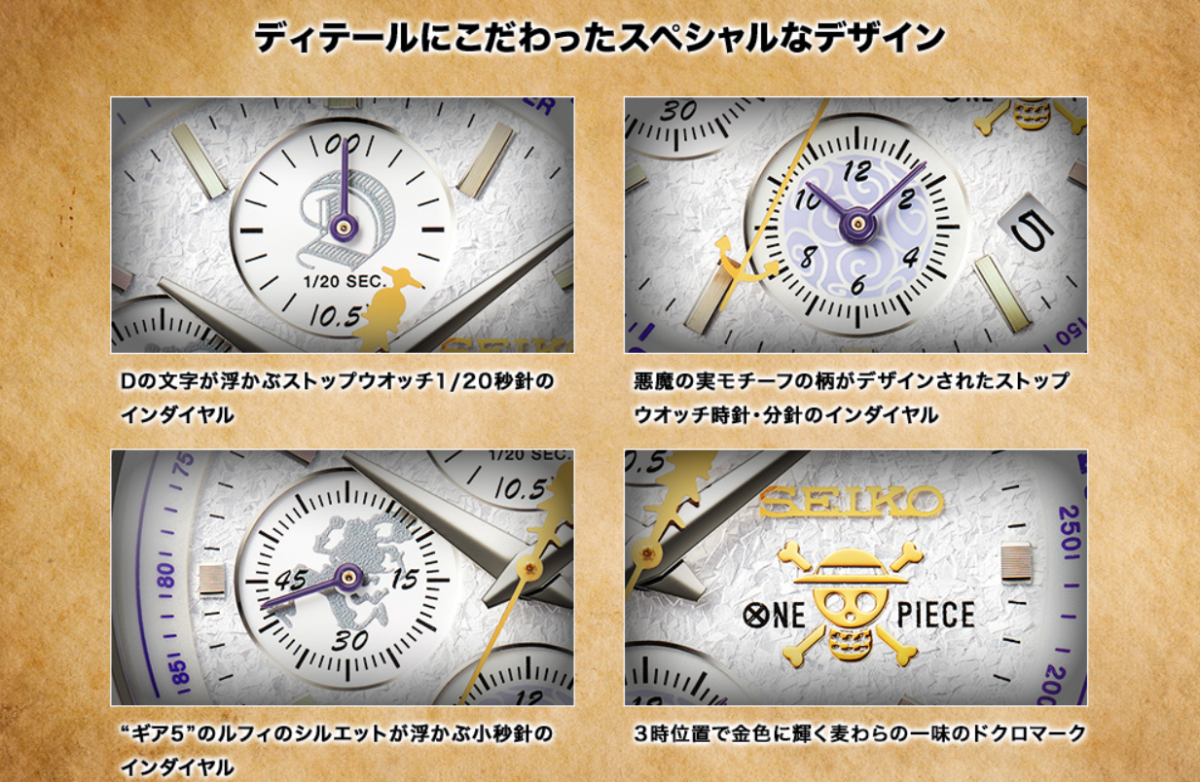 手錶設計上,採用三眼錶款的樣式,並在三眼各處別設置了 : 尼卡型態魯夫奔跑的剪影、代表魯夫的英文字母「D」 以及人人果實幻獸種·尼卡型態的圖案,展現五檔魯夫的元素在裏頭。