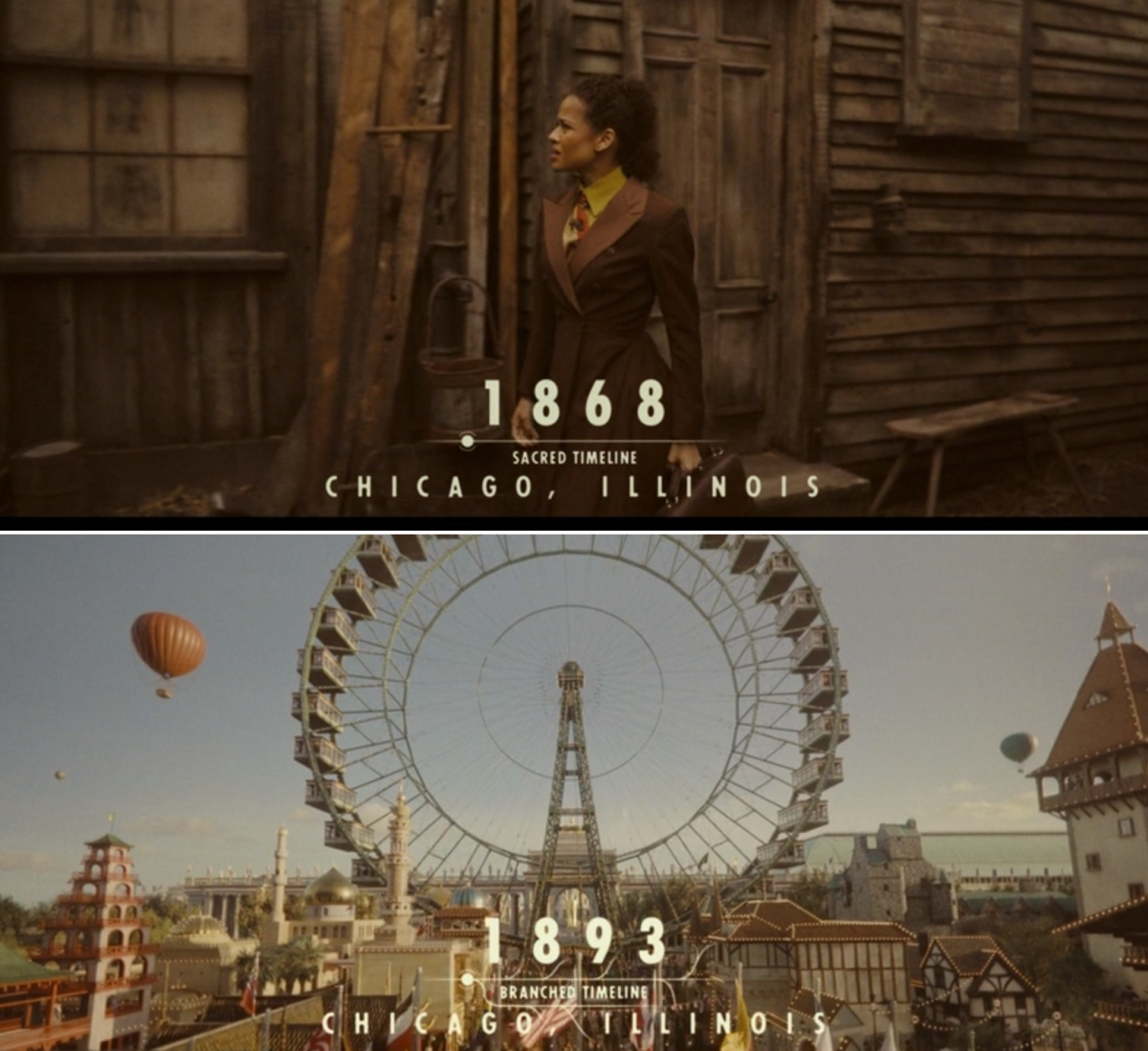 影片一開始,拉芙娜按照時間小姐的吩咐,來到1868年。此時可以注意到,標註上是「神聖時間線」意旨未來沒有遭到任何改變。不過當她將「TVA手冊」丟入年輕「維多泰姆利」(Victor Timely)家中後,1893年的時間軸即遭到改變。