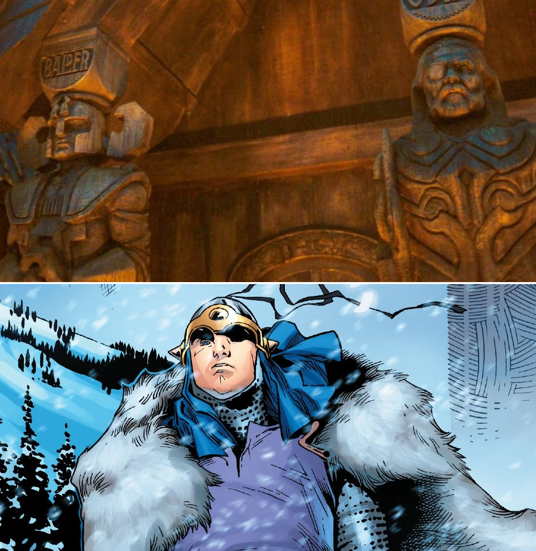 洛基看到北歐神雕像,發現自己的位子居然被「勇者巴德爾」(Balder the Brave)取代。在漫畫和北歐神話裡,巴德爾也是奧丁的生子,索爾的親兄弟。這似乎也讓洛基發覺,連地球人都知道自己不是奧丁親生的。