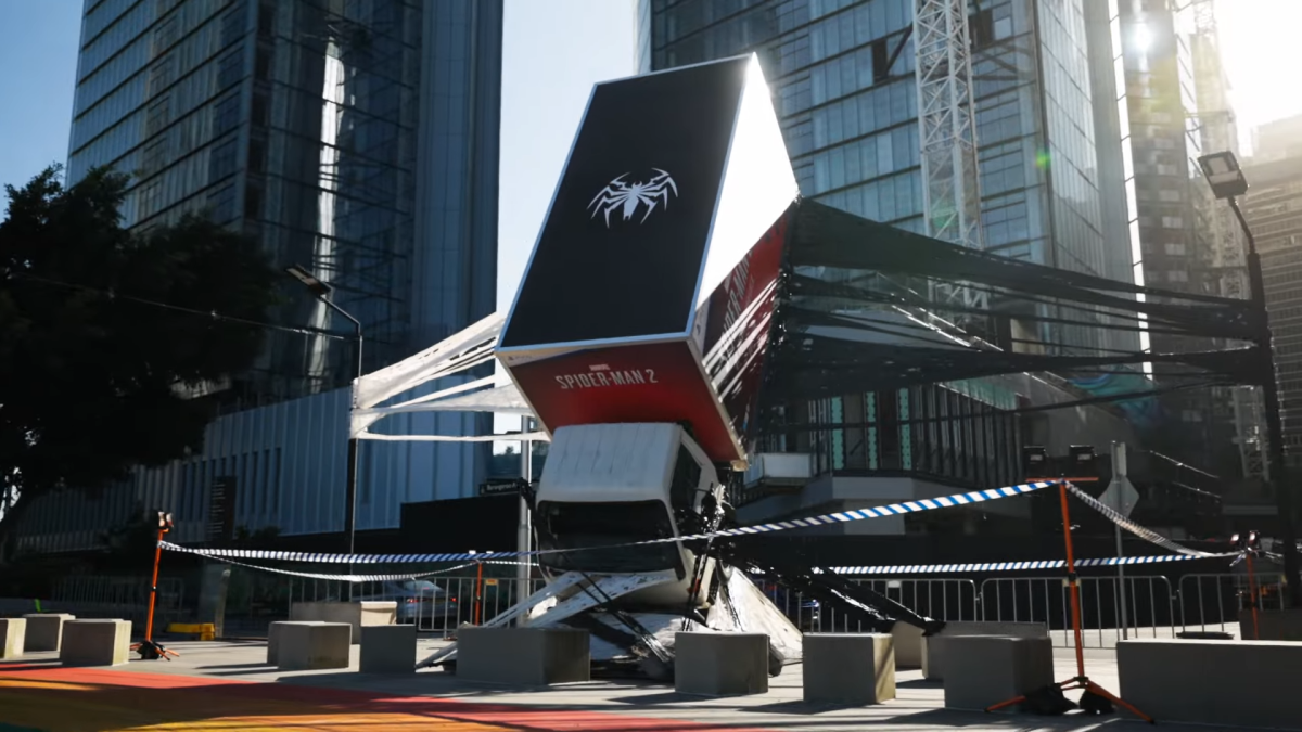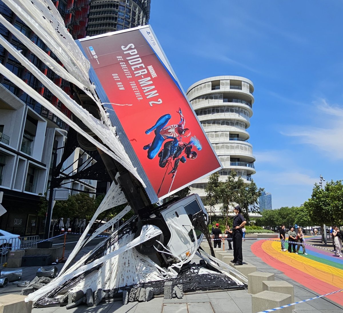 不僅是在口碑的熱絡上,PlayStation官方日前更是在雪梨「Watermans Cove」,設立了相當龐大的「裝置藝術」,來慶祝《漫威蜘蛛人2》的上市。可以看到場景以臨場感十足的設計,將蜘蛛人大量蜘蛛絲纏住即將翻倒的巨大卡車,且有趣的是,在另一側還能夠看到黑色共生體,來呼應在此次登場的角色「猛毒」。