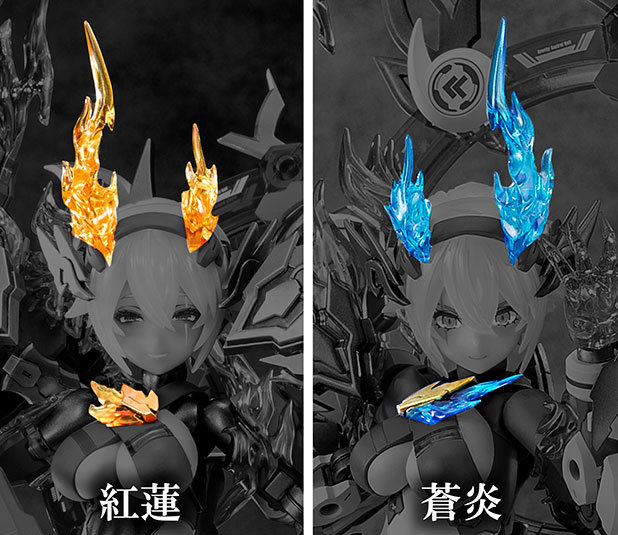 華麗的紅金色裝甲零件、背部的圓環形背包與火焰特效不僅僅能透過共通規格的 3mm 卡榫自由變換安裝位置、改變外形輪廓,更能組成變化多端的武裝模式,能夠組合出風格狂野的「狂氣模式」、外觀猶如鳳凰的「野獸模式」,甚至是使用蒼炎零件再現藍紅各半的最強合體形態。大劍型主武器除了平時展開火焰特效的劍形態外,還能透過變換組合方式再現長鞭、槍、尾巴...等形態。