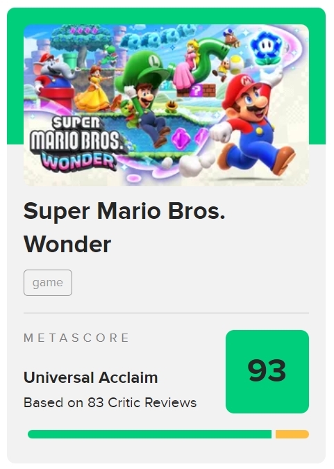 先來看評分網站Metacritic上的成績,除了拿到平均91分的《漫威蜘蛛人2》,任天堂的《超級瑪利歐兄弟 驚奇》則是得到83家電玩媒體的評分,成功獲得平均93分的絕佳成績單,大力誇讚《超級瑪利歐》總是不斷給玩家意想不到、永無止境的驚喜,這一次也並不例外。