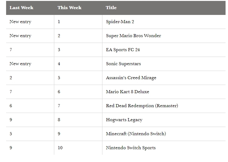 而銷售方面,根據英國實體遊戲排行榜上,《漫威蜘蛛人2》則是超越《超級瑪利歐兄弟 驚奇》,成功拿下第一的位置,而後者則也不惶多讓地位居第二。且據悉,這也是繼《薩爾達傳說 王國之淚》(ゼルダの伝説 ティアーズ オブ ザ キングダム)、《EA SPORTS FC™ 24》,以及《霍格華茲的傳承》(Hogwarts Legacy)後,成為英國本年度第四大實體銷售成績。至於《超級瑪利歐兄弟 驚奇》,則是列於英國排行榜史上第三大《瑪利歐》遊戲的實體發行。