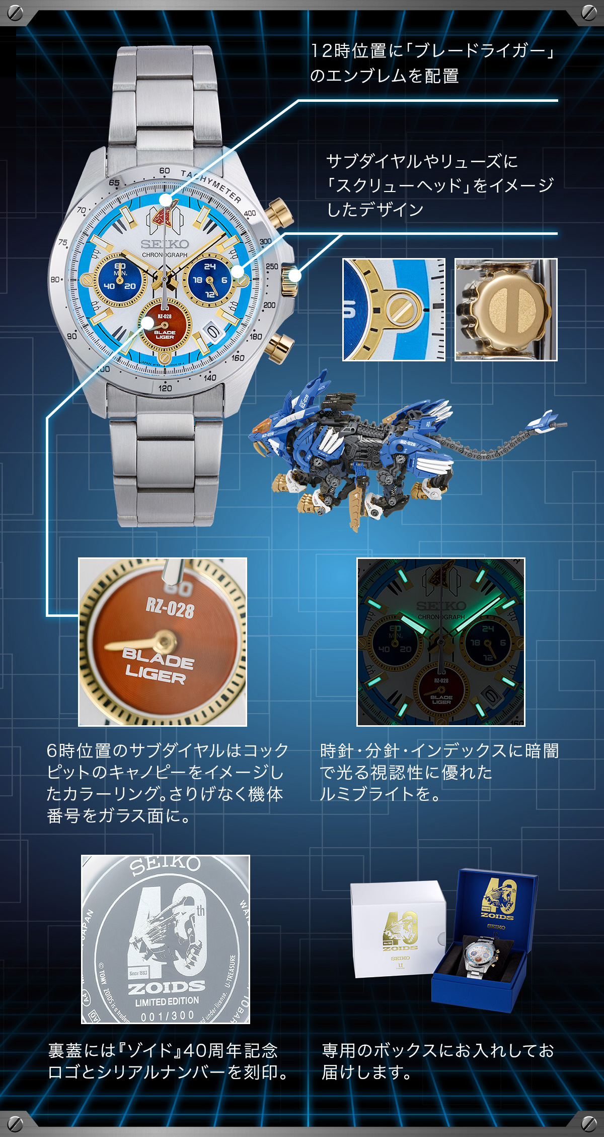 這次錶款以系列最為人氣的代表機體『RZ-028 BLADE LIGER 超重劍長牙獅』( ブレードライガー ) 為主題,除了基本的色系配置外。在錶盤上 12 點鐘處有著超重劍長牙獅的標誌外,6 點鐘處三眼小錶盤的顏色靈感來自駕駛艙頂蓋;指針則有蓄光效果,黑暗中也能清楚辨識,而錶背刻有 40 週年紀念標誌和限量編號。