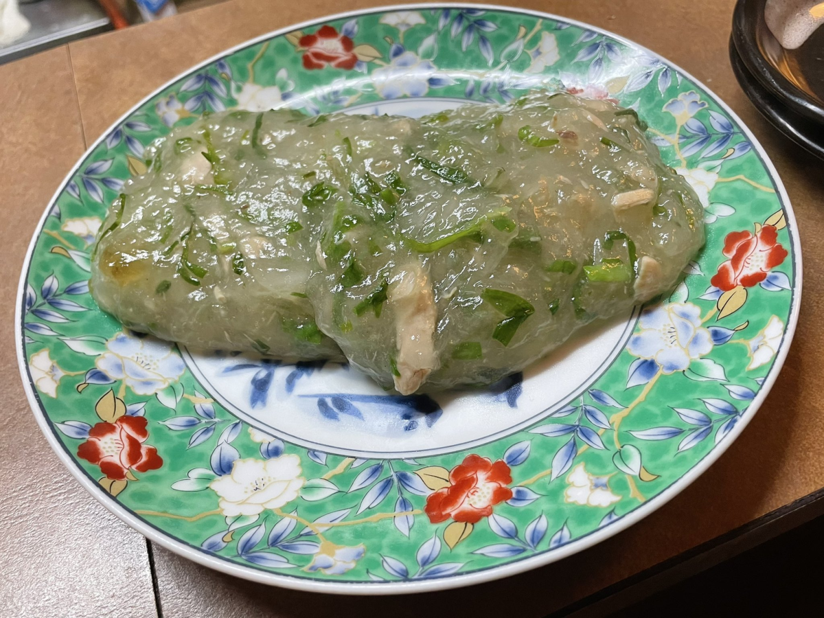 一開始推主只知道這是個半透明的餅狀物,裡面似乎包著韭菜、肉類等,總之點了就要吃,而吃了之後他大為震驚,居然很好吃!據推主評價,吃起來有鰹魚高湯加上文字燒的味道與口感,裡面包著韭菜和雞肉,非常好吃。