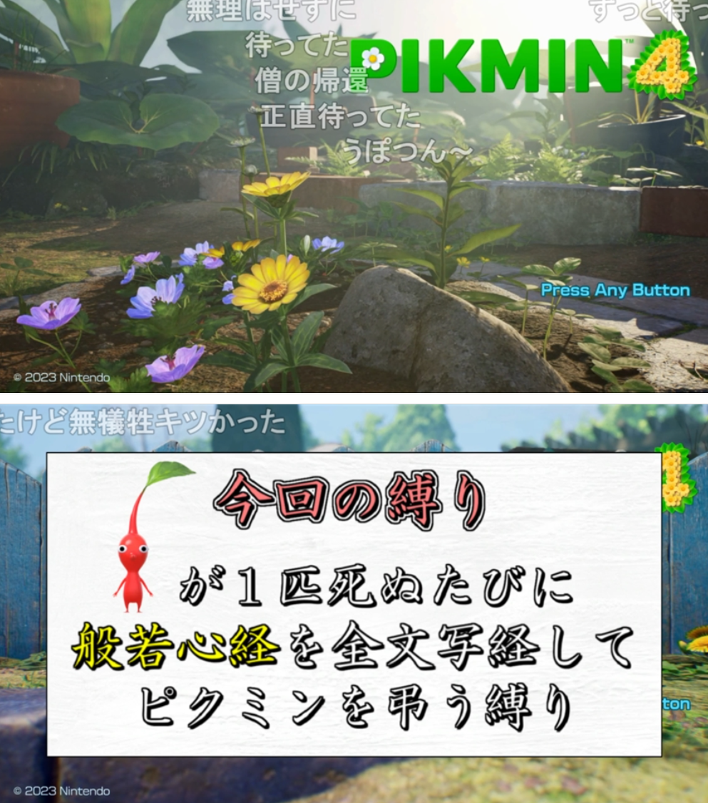 日本一位實況主キャベツ (@kyabetutaro121 ) 在 Niconico 上放上自己遊玩《皮克敏4》的影片,規則是「每陣亡一隻就要手抄心經一回」,這樣奇特的規則吸引不少觀眾欣賞,更有不少網友讚賞他的玩法。