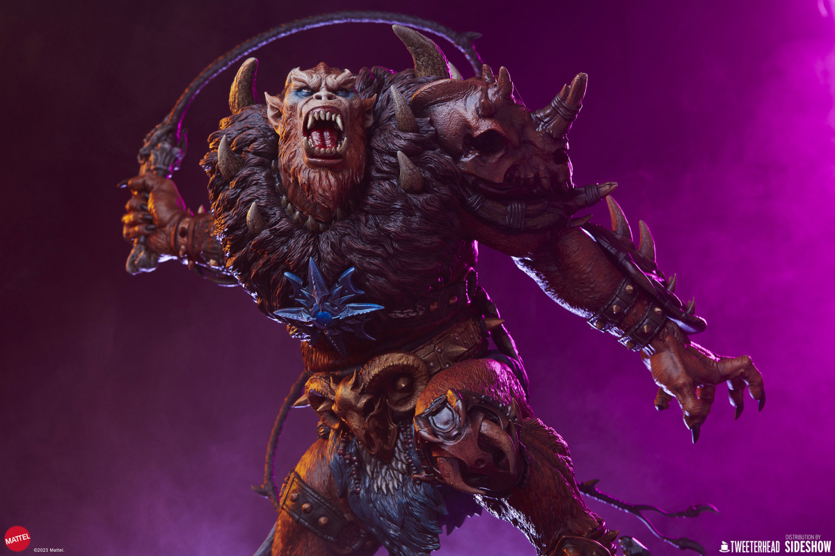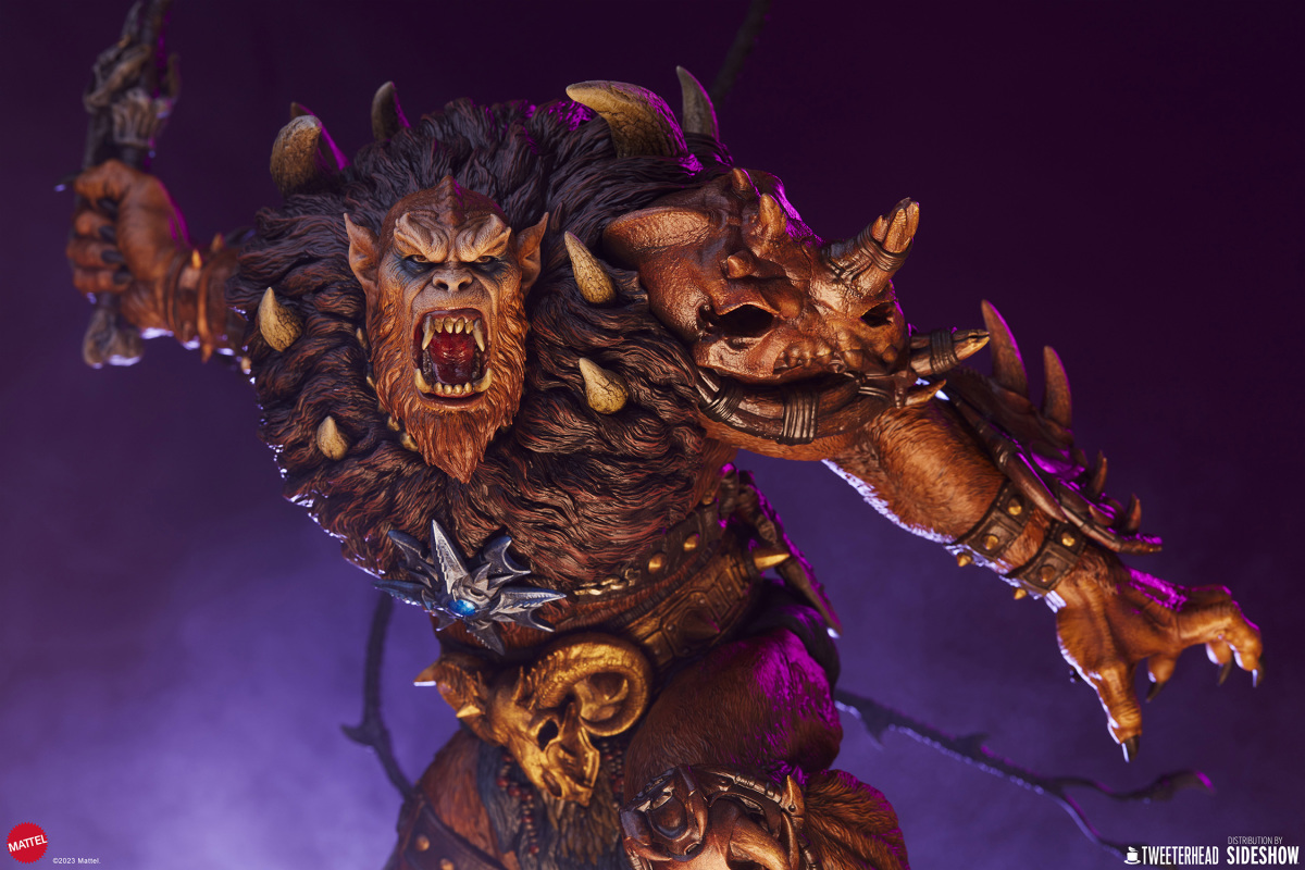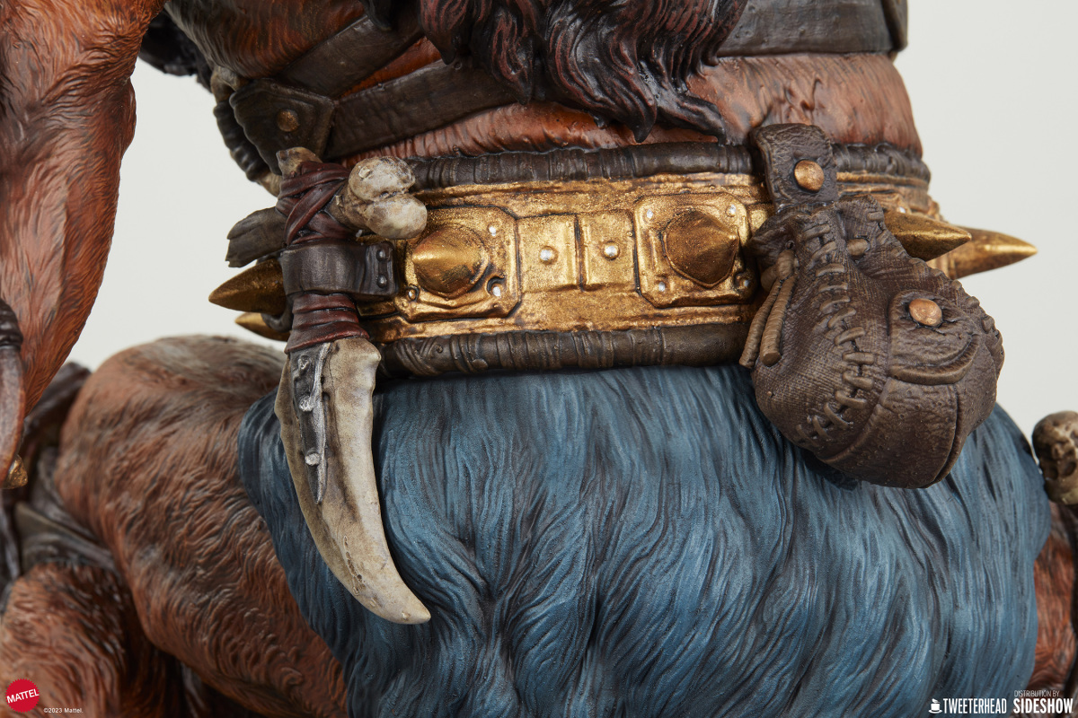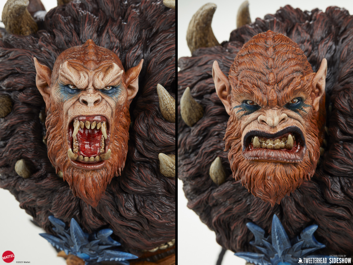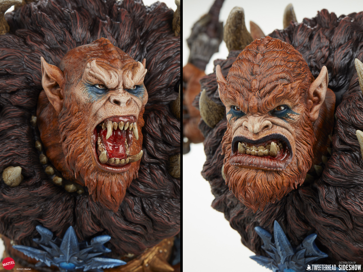 在《太空超人》的故事中,獸人跟上回小編介紹的鯊魚嘴都是大反派骷髏王(Skeletor)的手下,不過說起這兩位角色,各位玩具人印象最深的可能不是他們做過的壞事,而是他們每每犯錯被骷髏王臭罵一頓,再不然就是被太空超人輕鬆揍飛的滑稽模樣;不過在 Tweeterhead 這系列的《太空超人》主題雕像中,獸人可是以相當凶暴的形象登場,如果說先前的鯊魚嘴強化了全身上下的金屬質感,那這次的獸人就是深刻展現出毛髮細節與野性裝備的風格魅力。