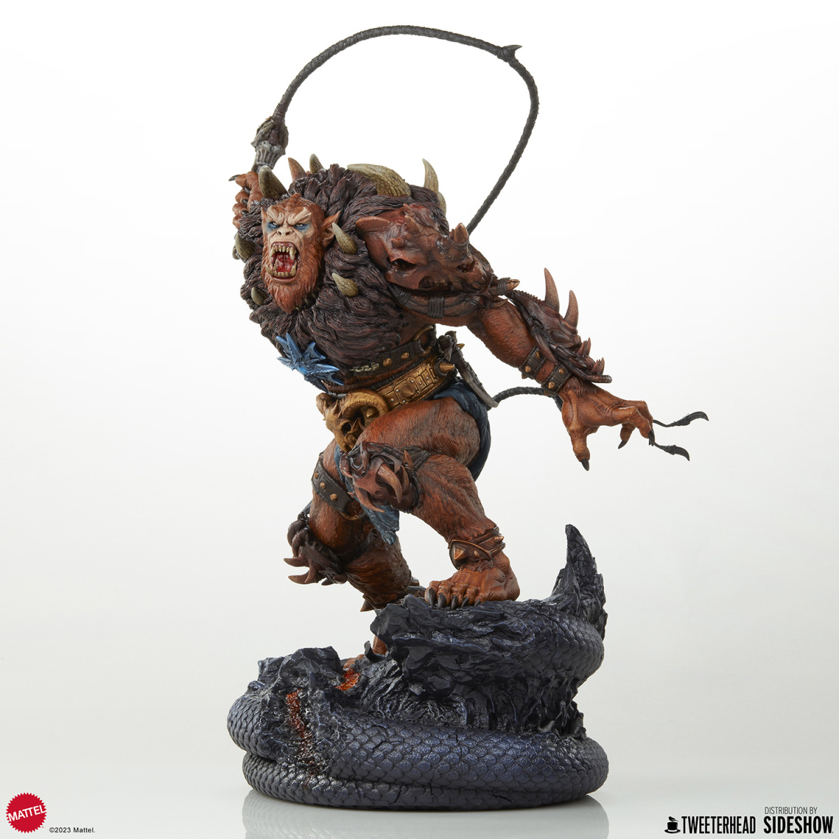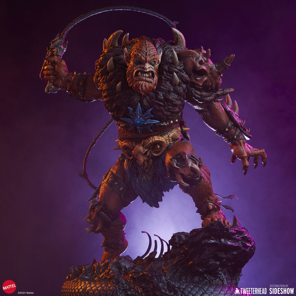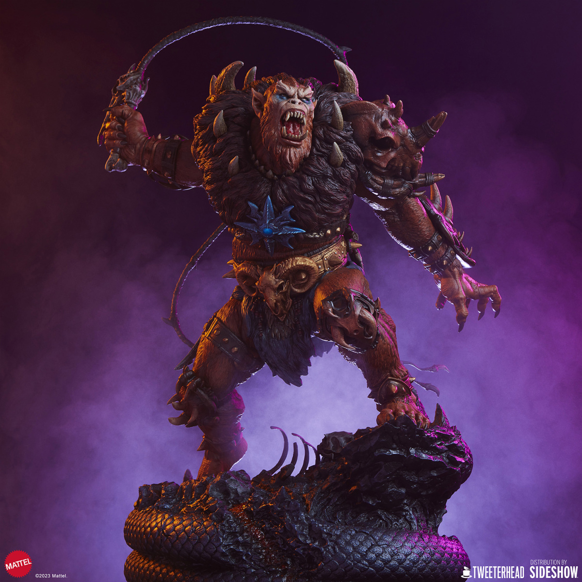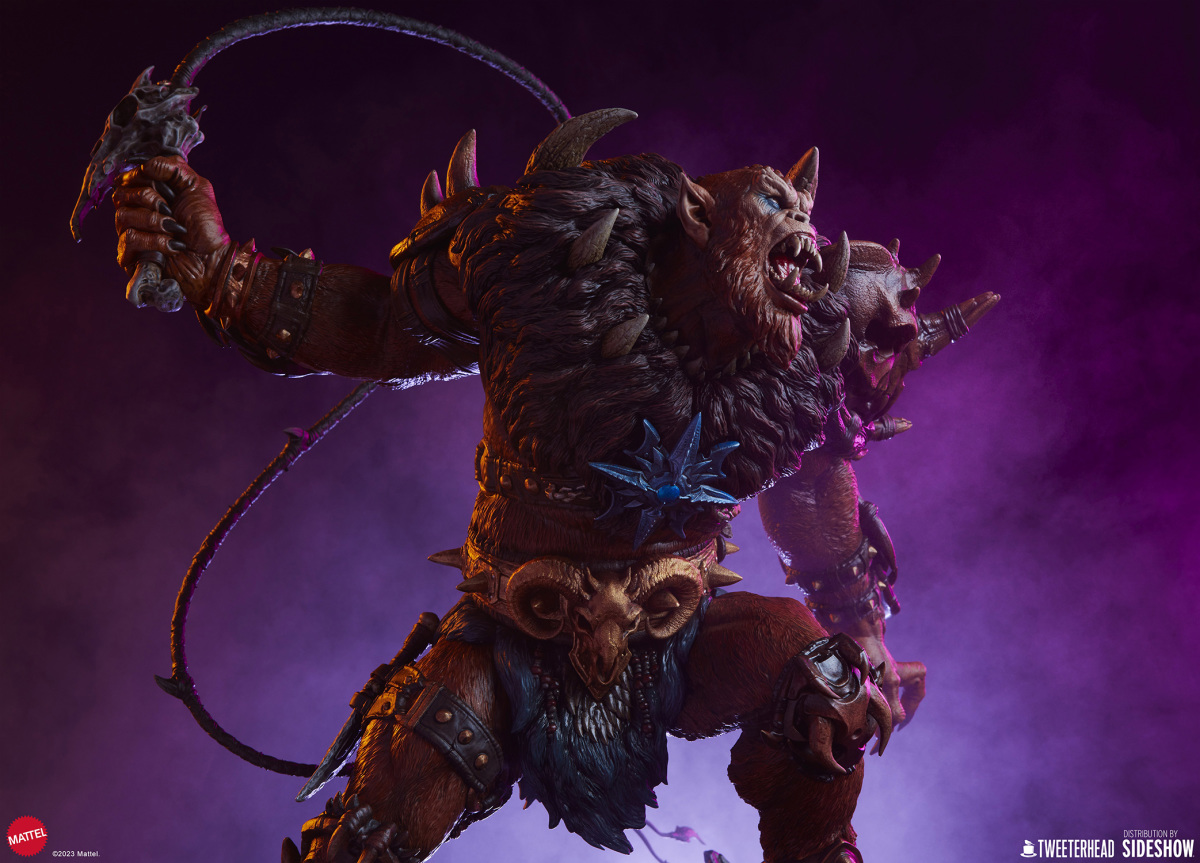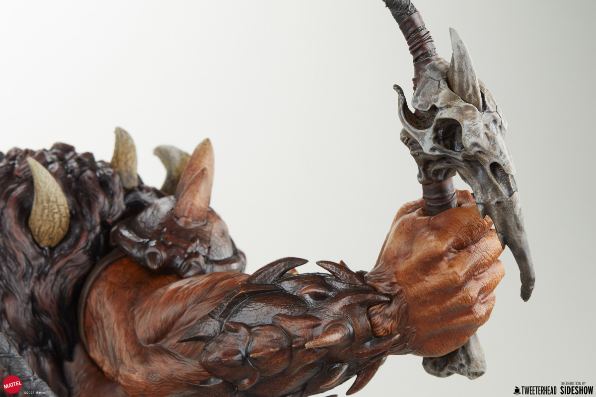在《太空超人》的故事中,獸人跟上回小編介紹的鯊魚嘴都是大反派骷髏王(Skeletor)的手下,不過說起這兩位角色,各位玩具人印象最深的可能不是他們做過的壞事,而是他們每每犯錯被骷髏王臭罵一頓,再不然就是被太空超人輕鬆揍飛的滑稽模樣;不過在 Tweeterhead 這系列的《太空超人》主題雕像中,獸人可是以相當凶暴的形象登場,如果說先前的鯊魚嘴強化了全身上下的金屬質感,那這次的獸人就是深刻展現出毛髮細節與野性裝備的風格魅力。