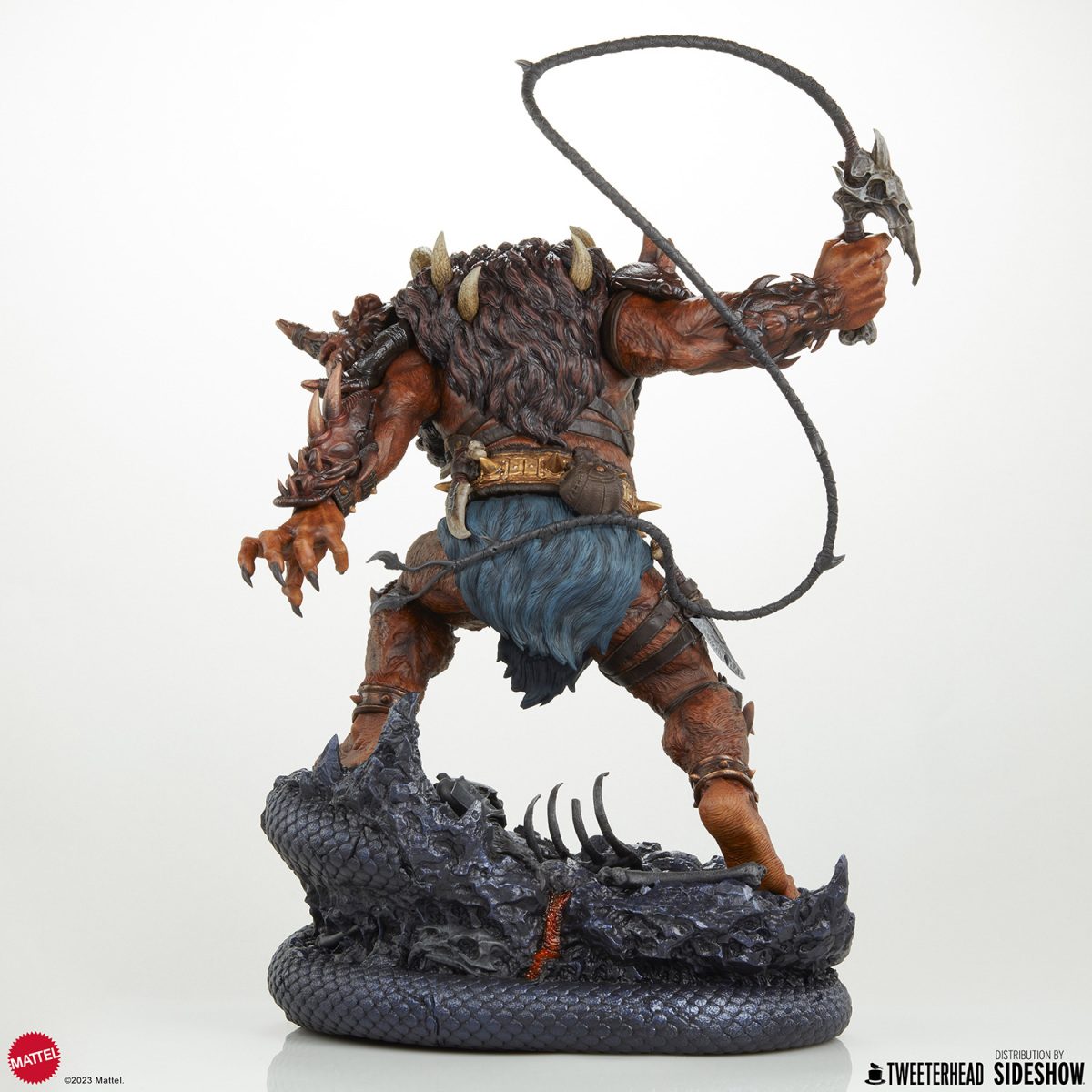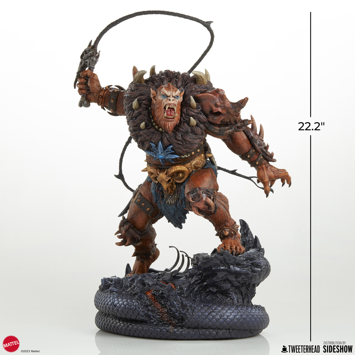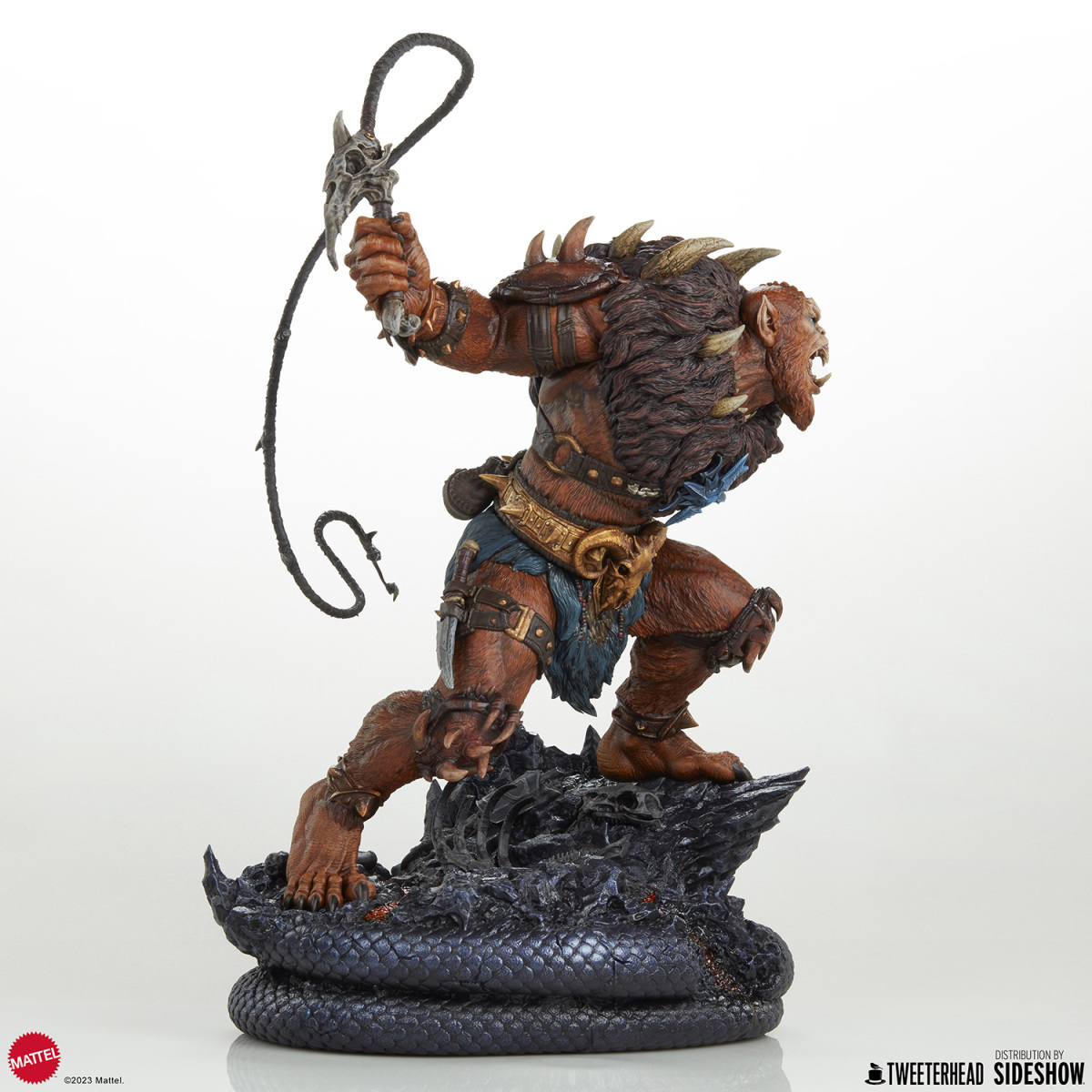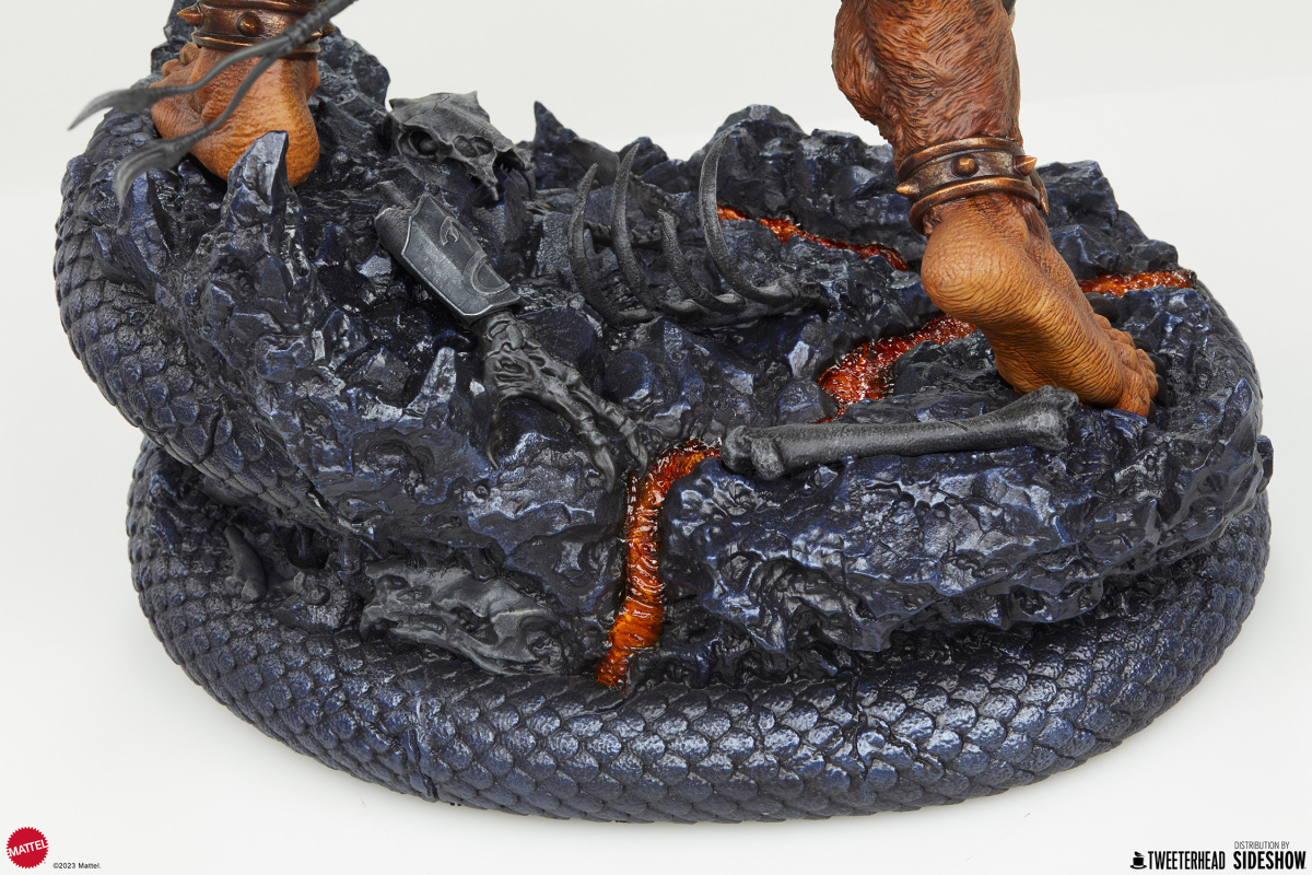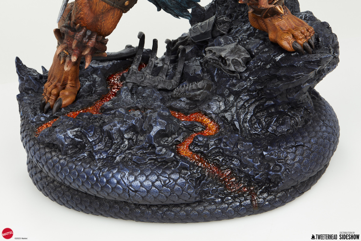 本作高約 56 公分,打造出獸人手持長鞭的怒吼造型,從濃密的鬃毛、壯碩的肌肉線條、動物頭骨製成的左肩甲,到利用動物骨頭打造的小刀、長鞭都傳達出濃厚的原始氣息,漆黑的利爪、經過細緻塗裝的腰帶與帶刺手環,以及標誌性的指南針都施以高度造型力!頭雕還有復古、現代兩種風格可以更替,底座是依照劇中經典場景「蛇山 (Snake Mountain) 」為題打造,好帥啊!