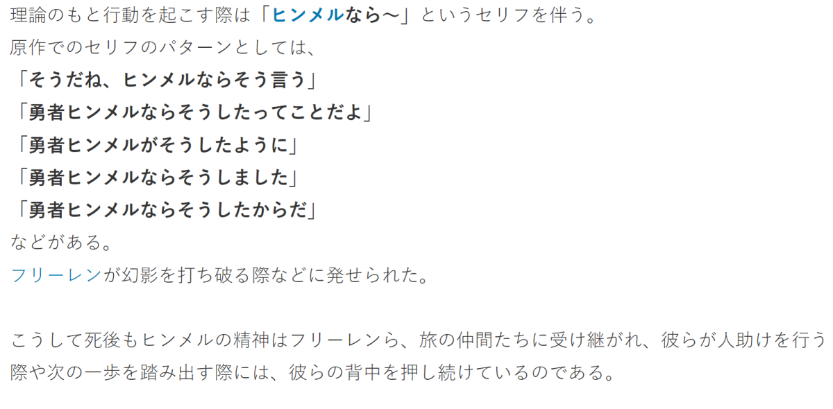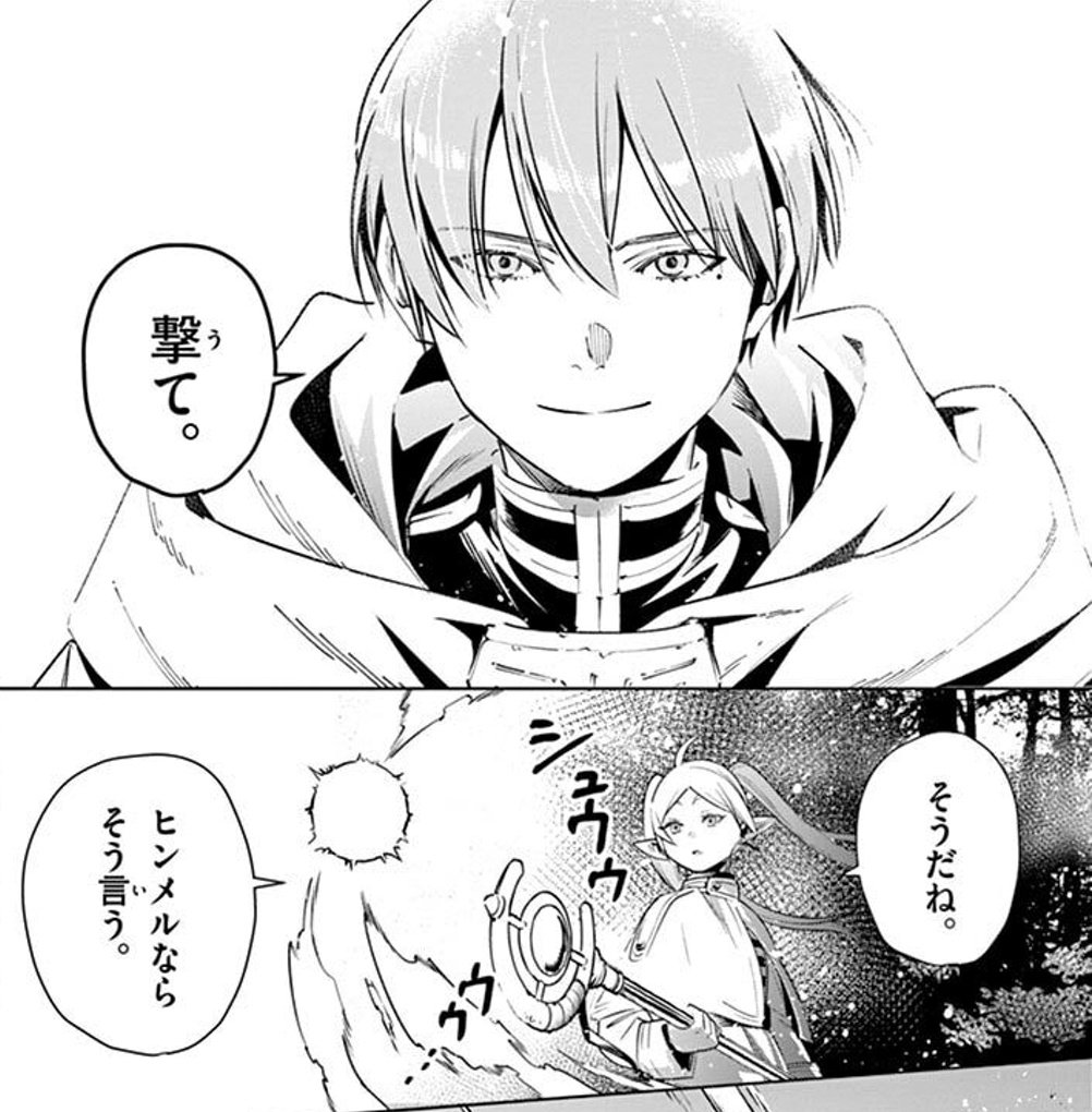 原作漫畫中也出現非常多以「ヒンメルなら~」的台詞,雖說欣梅爾在故事中已經離世,卻不失存在感出現在各種回憶片段與內心世界,彷彿當年那個討伐魔王途中熱於助人受到愛戴的勇者,還跟隨著芙莉蓮一起展開新的旅程。