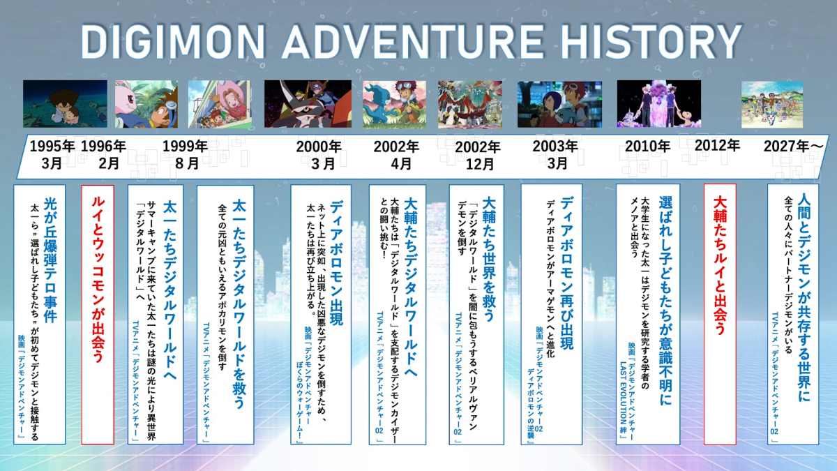而在《數碼寶貝大冒險02 THE BEGINNING》電影上映前夕,官方於YouTube頻道「デジモンパートナーズ公式チャンネル」中,開啟直播回顧《數碼寶貝大冒險02》TV動畫的同時,更曬出了自1995年,太一、嘉兒首次遇見滾球獸(出自《數碼寶貝:滾球獸的誕生》),到2027年,也就是《數碼寶貝大冒險02》最後一集之間的編年史。
