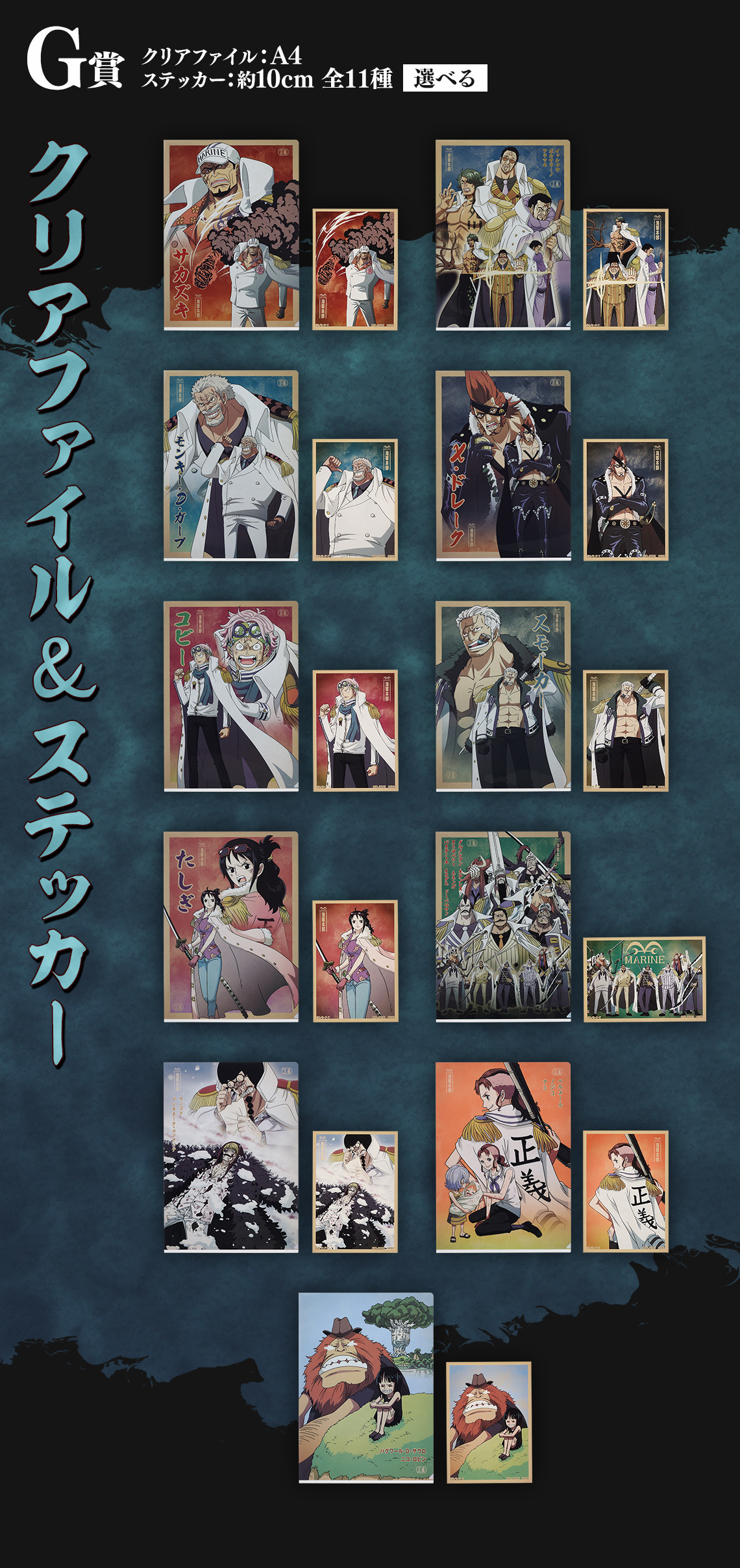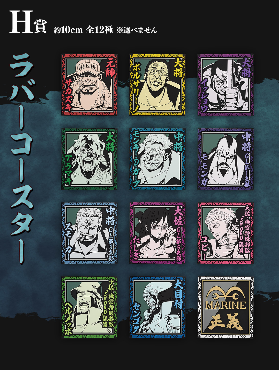 『一番賞 ONE PIECE航海王 絕對的正義』以《航海王》中代表「絕對正義」的海軍為主角,共推出 A ~ G 賞+最後獎、雙重中獎機會等豐富的獎品,以魄力尺寸、更高規格的「MASTERLISE EXPIECE」系列霸氣呈現!收錄有海軍元帥 A賞 「赤犬」盃、海軍本部上將 B賞「黃猿」波爾薩利諾以及 C 賞「藤虎」一笑、D賞「綠牛」荒卷,精緻塑造壯碩的筋肉體態、臉上皺紋和鬍渣,在服裝上也是豪氣且細膩地雕琢,霸氣滿分!另外還有海軍士兵、壓克力立牌、資料夾貼紙套組、橡膠杯墊等豐富的獎品!