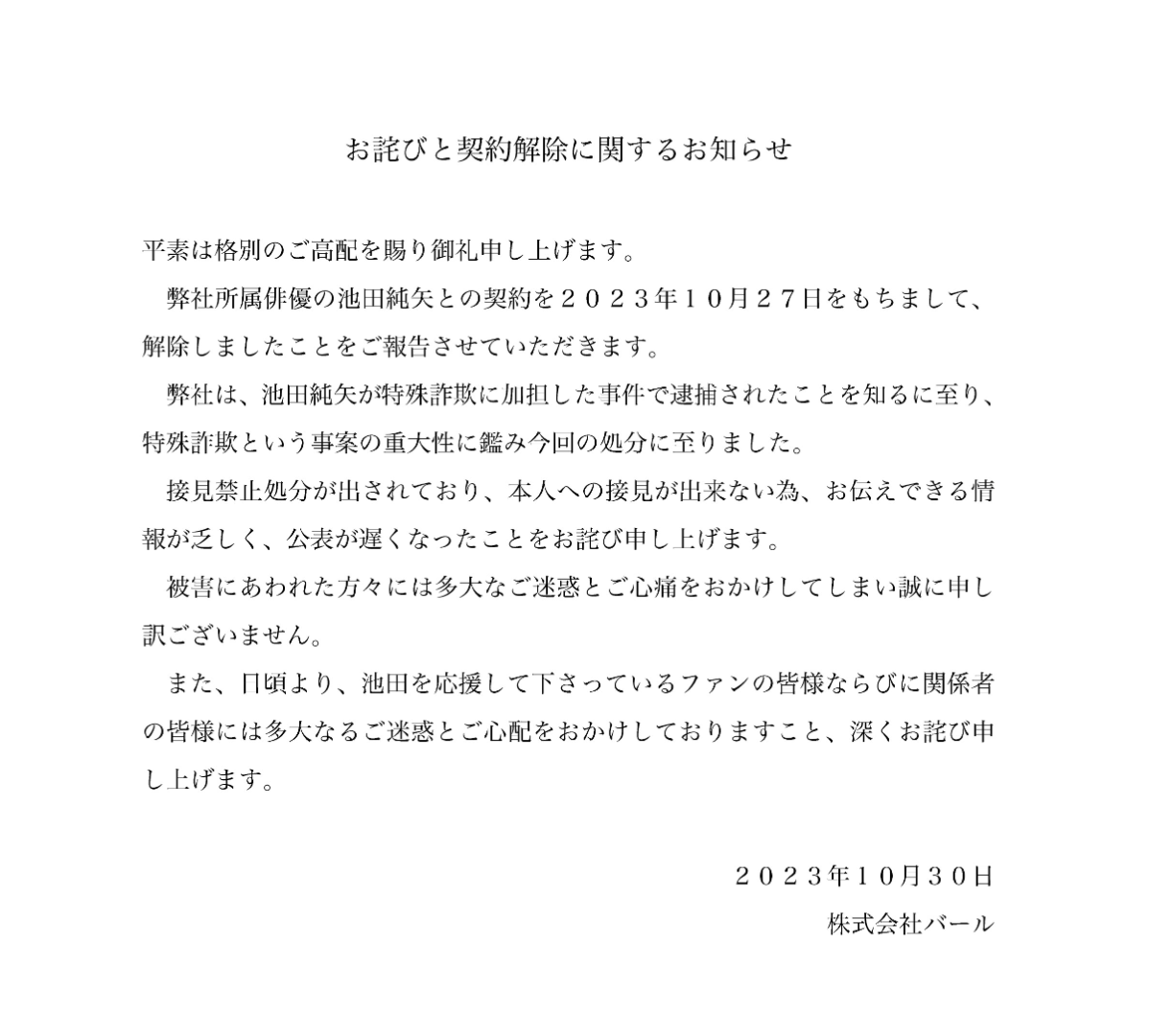 經紀公司 BaRU 也在今日發表聲明,已經在 10 月 27 日將池田純矢解約,由於針對其犯案的特殊詐欺罪重大性感到擔憂,希望嚴懲以對社會大眾負責。目前已遭受押禁見,所以對於解約事項才遲了幾天公開。對於被害者造成巨大困擾,在此致上最深的歉意。