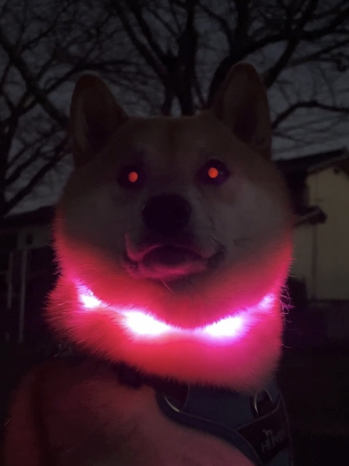 但也因為脖子上項圈散發出來的光芒,使得柴柴的雙眼發出了超有戲劇系的紅光,彷彿就像是拒否柴的最終進化,或者就像是賽博龐克題材中的藏件情節一樣,向他的飼主發出鄭重地宣示:「本柴就是不想回家」一樣,霸氣外露的模樣逗得讓網友哈哈大笑,表示他感覺充滿了怨念XD