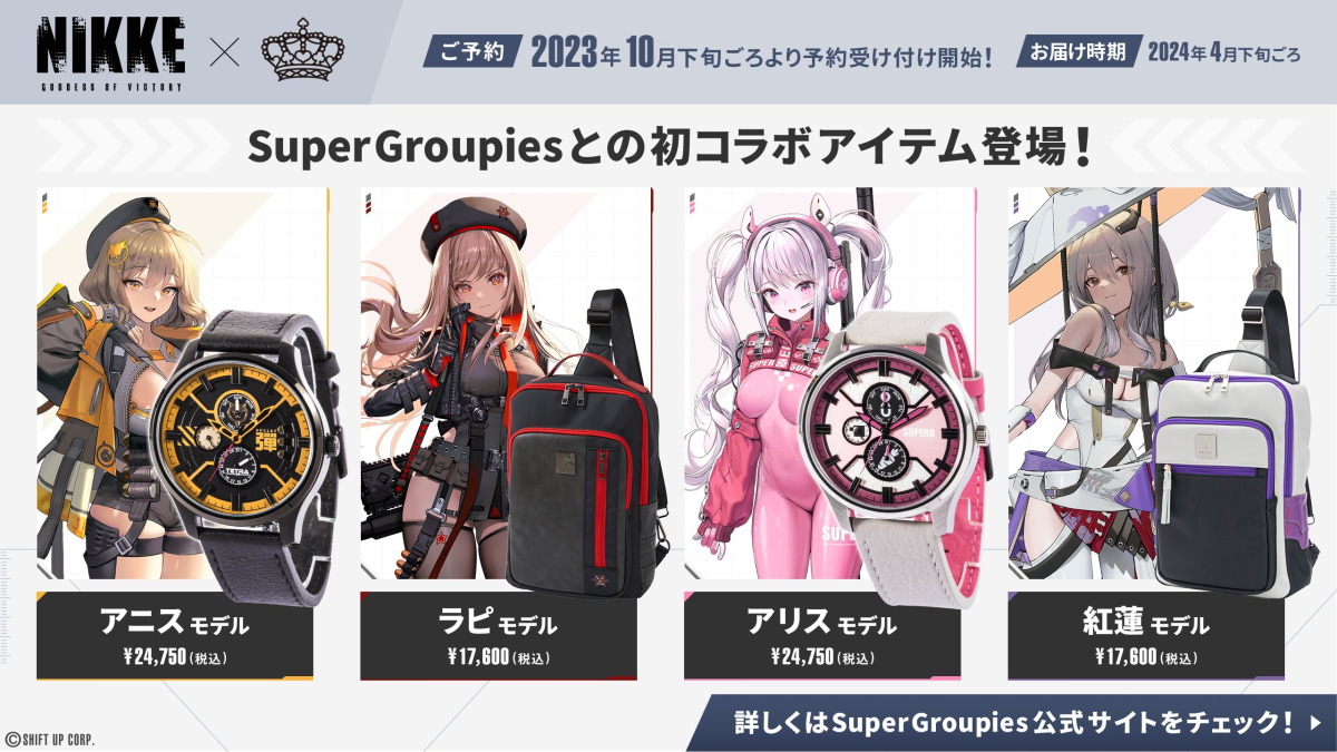 韓國 ShiftUp Corp 製作的手機遊戲《勝利女神:妮姬》,自去年 11 月發行後就有不錯的人氣,在韓、日與台灣都有不少玩家喜愛。近日宣布與專門與動漫遊戲合作的日本時裝品牌 SuperGroupies 合作,推出四位角色的主題手錶以及側背包,目前已開放預購,預計 2024 年 5 月開始出貨。