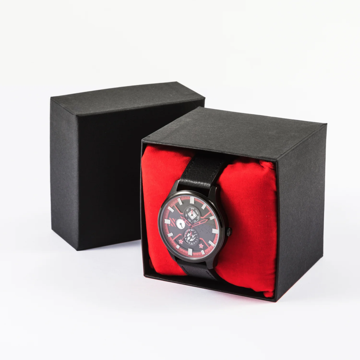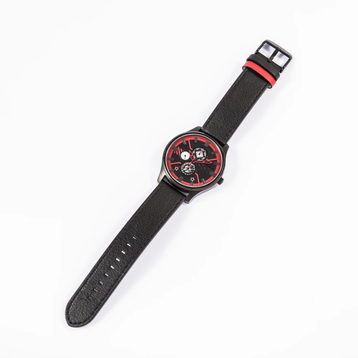 以人物形象的黑紅配色打造,錶盤也有著拉毗所持的步槍上的菱格圖案,有著簡單又有力的外觀。