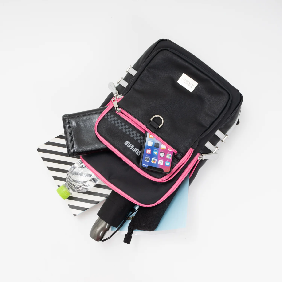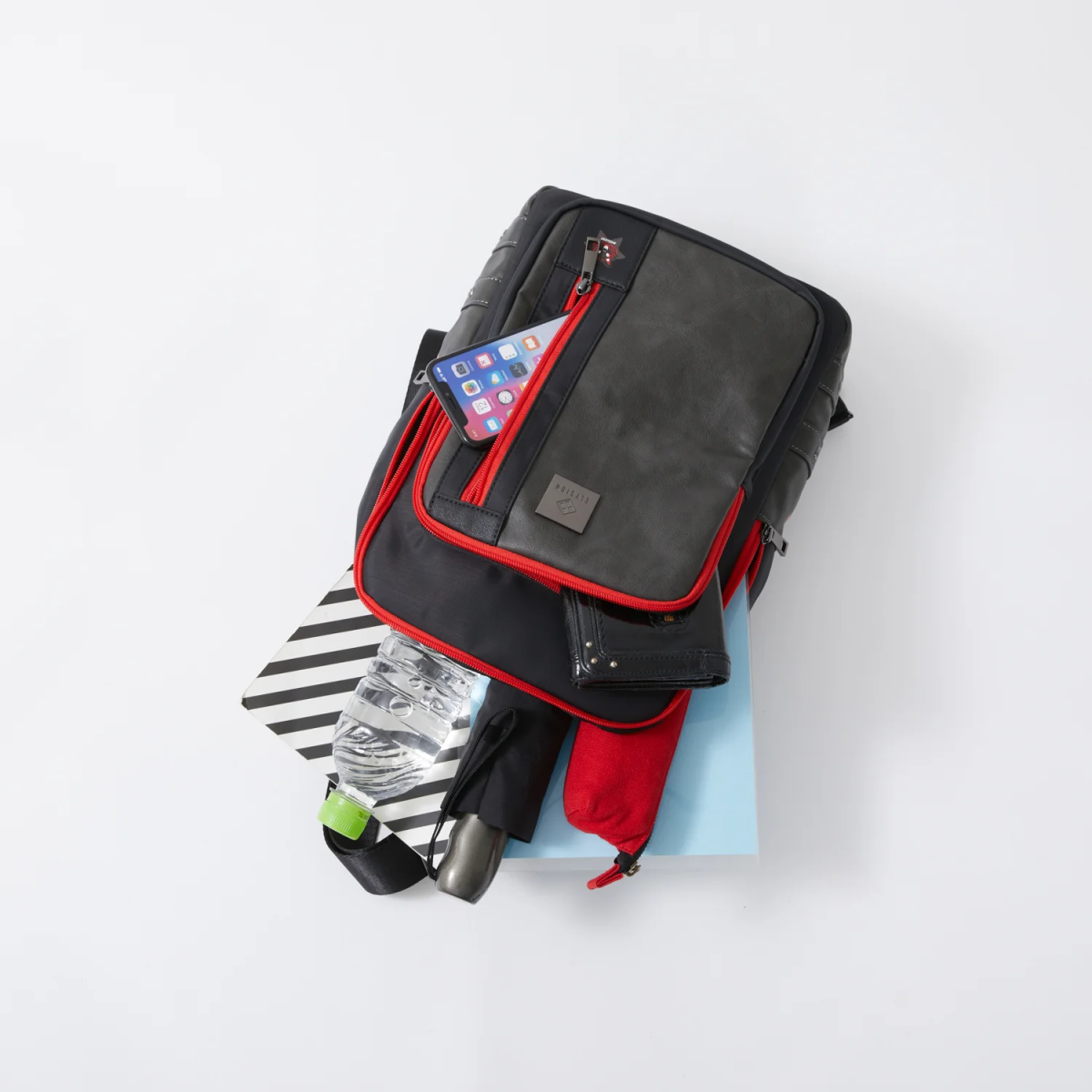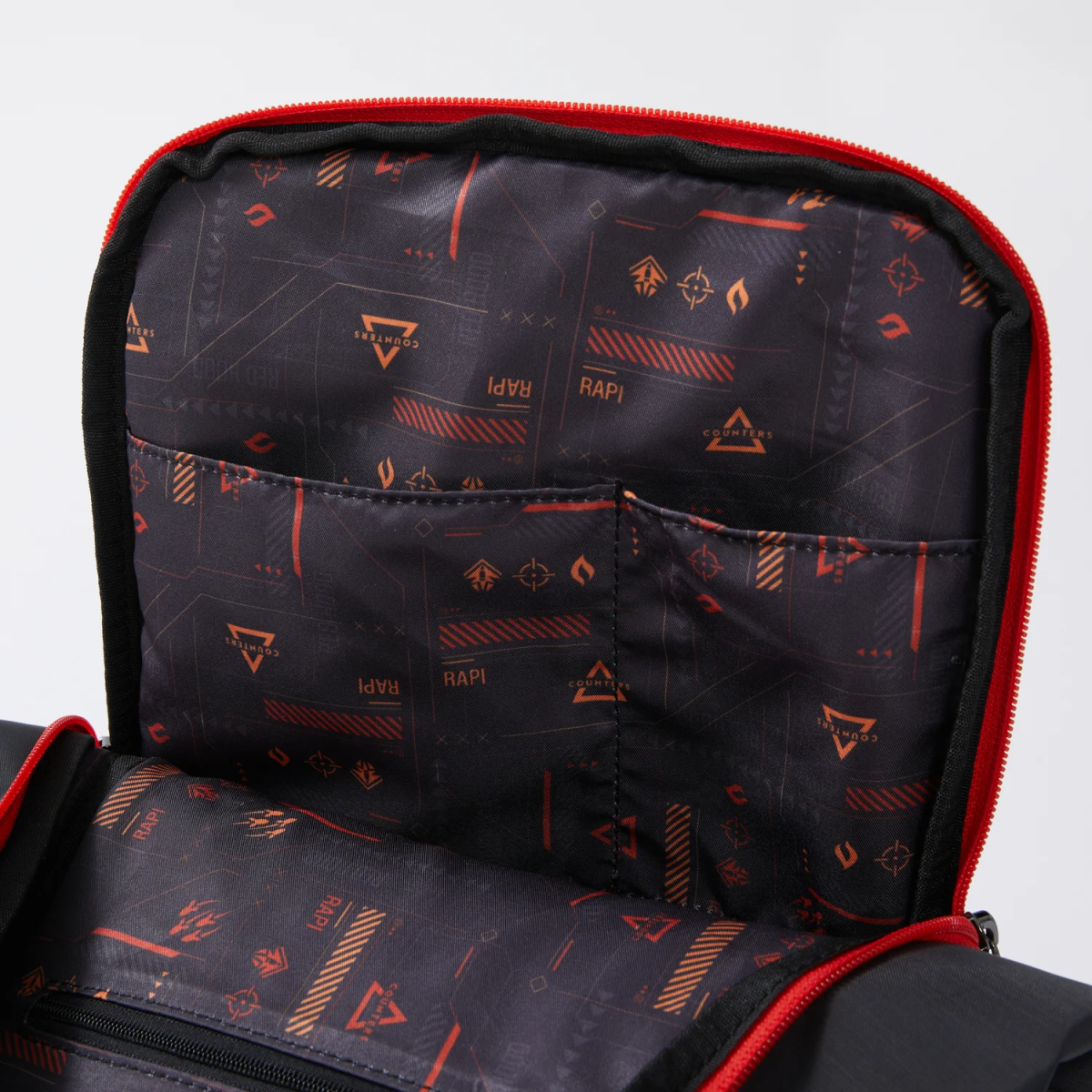 同樣以黑紅配色打造,多空間的收納機能可以滿足一般日常生活所需,內裡也有拉毗專屬的滿版印花圖案作點綴。