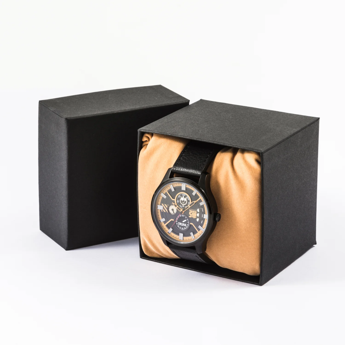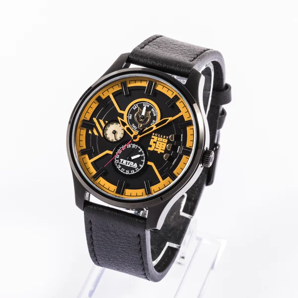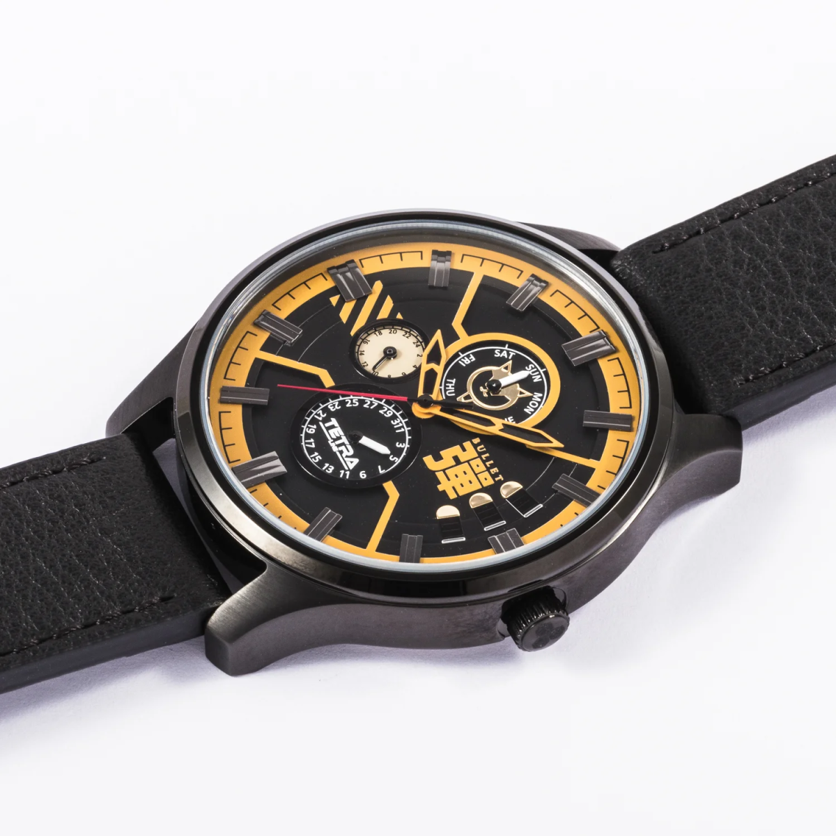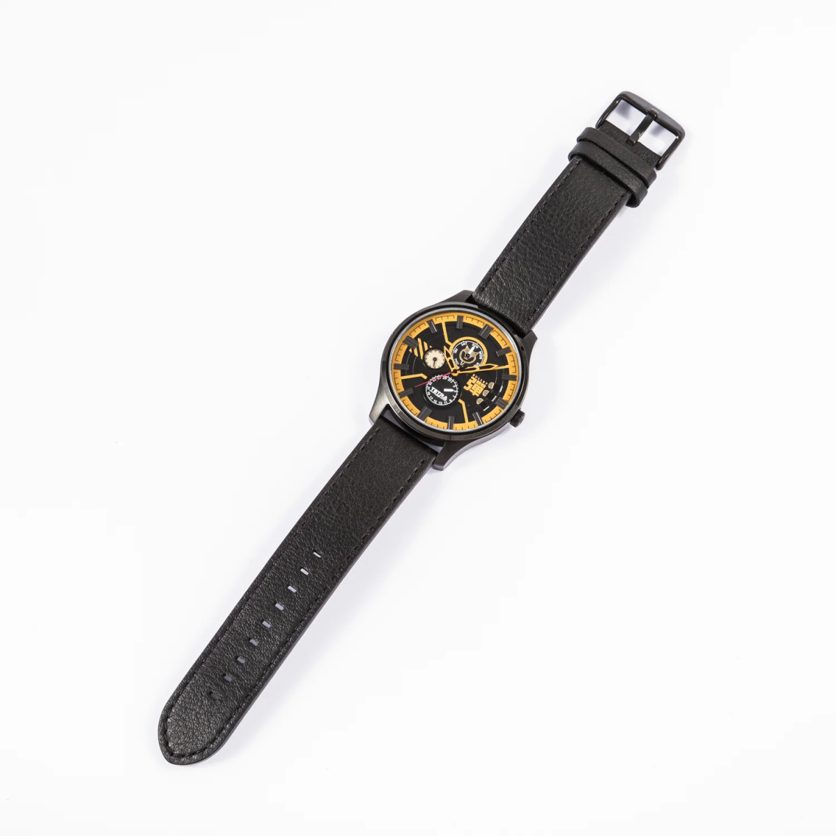 以人物形象的黑黃配色打造,錶盤也有著阿妮斯左腿長襪上的「彈」文字字樣 ,具辨識度也不馬虎的設計。