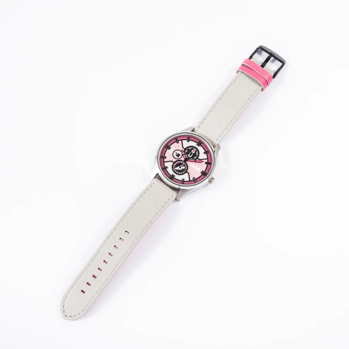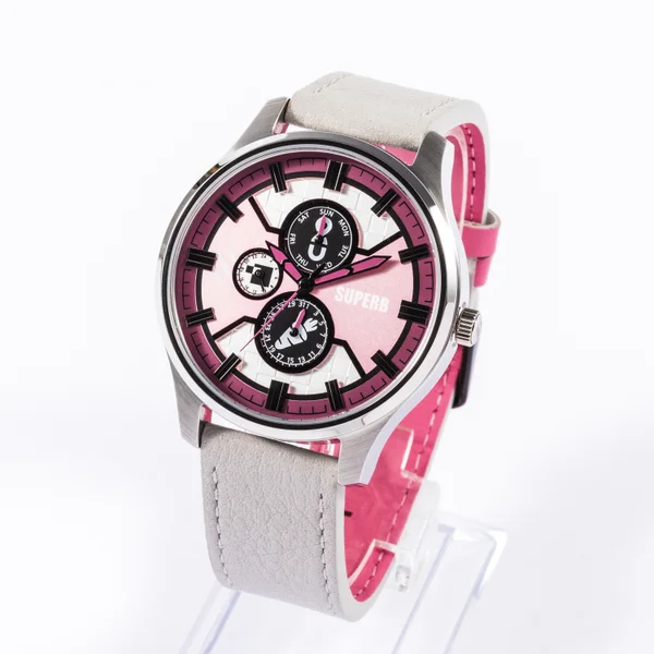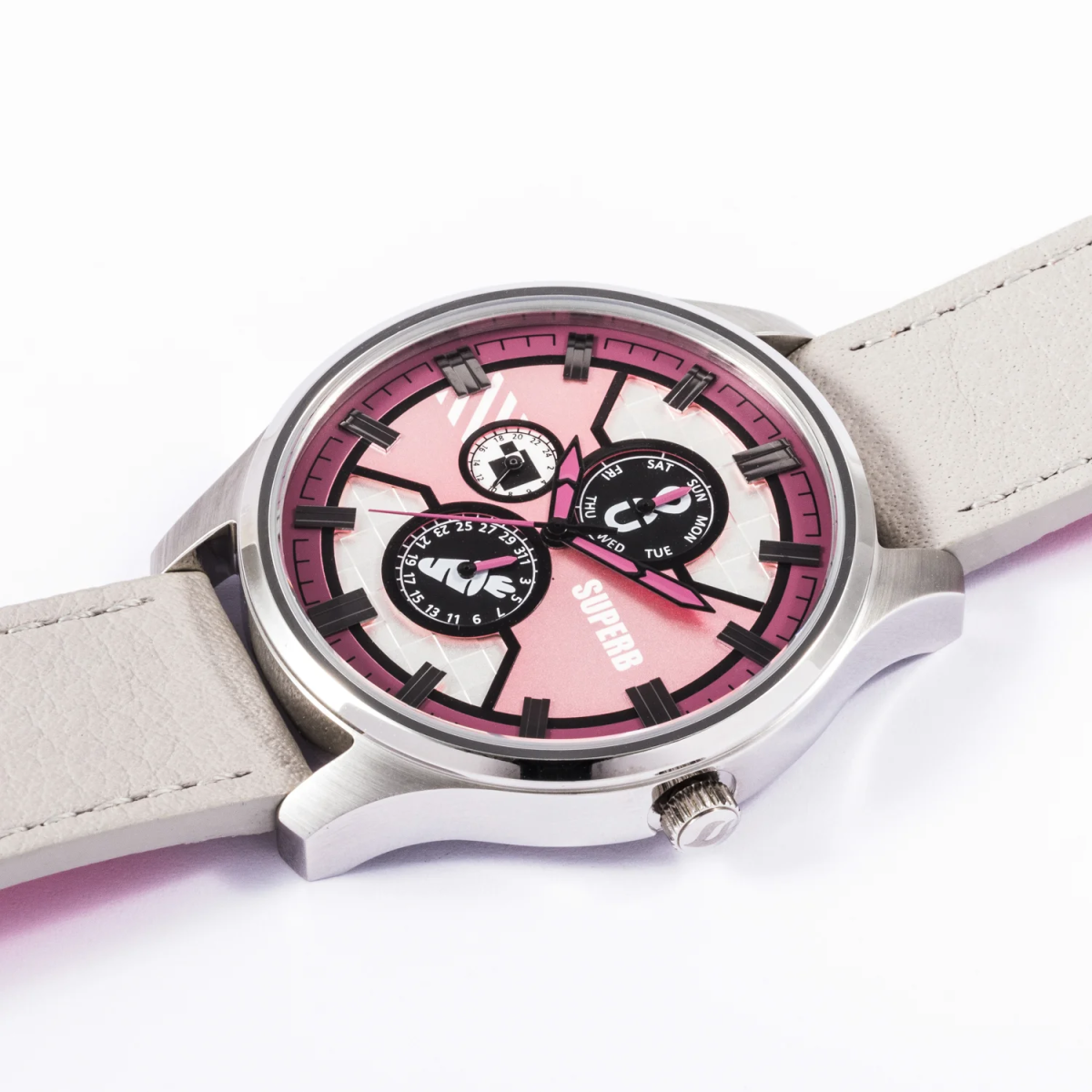 以人物形象的白粉紅配色打造,錶盤也有著愛麗絲所穿緊身服上的「SUPERB」文字字樣 ,具有少女氣息又不失戰鬥意味的設計。