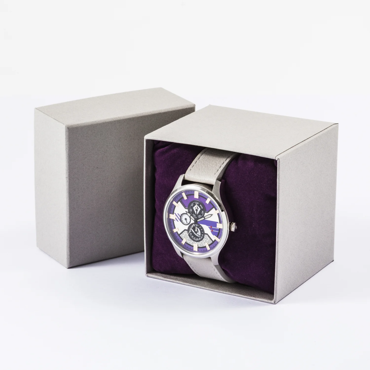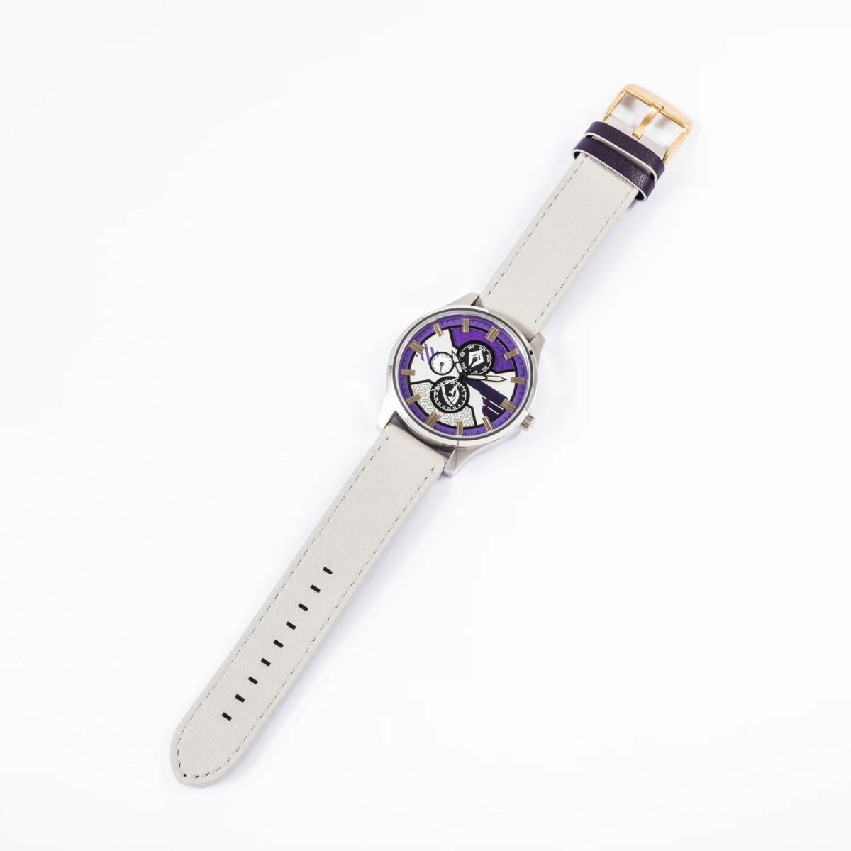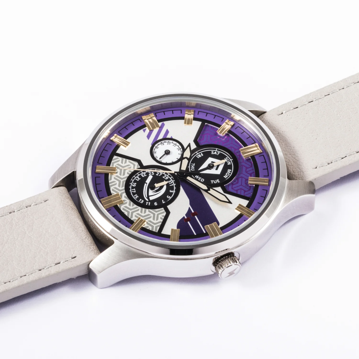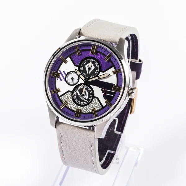 以人物形象的白紫配色打造,錶盤也有著紅蓮所代表的幾何圖案造型,看似女性風格但也有著強烈的個人色彩。