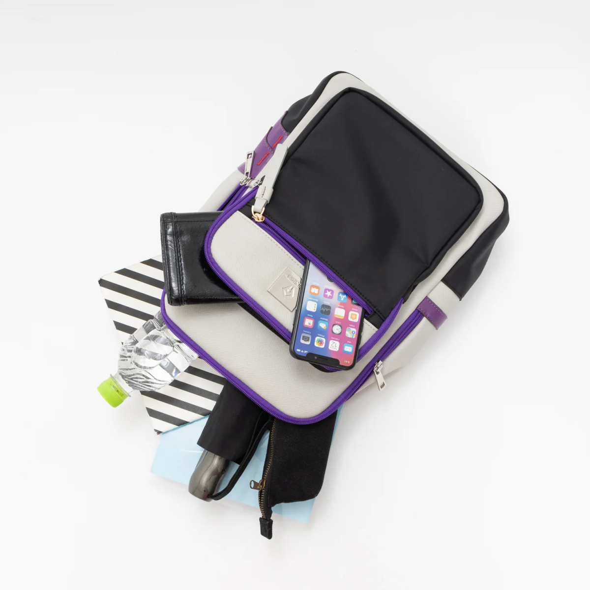 以黑白紫三配色打造,多空間的收納機能可以滿足一般日常生活所需,內裡也有愛麗絲專屬的滿版印花圖案作點綴。